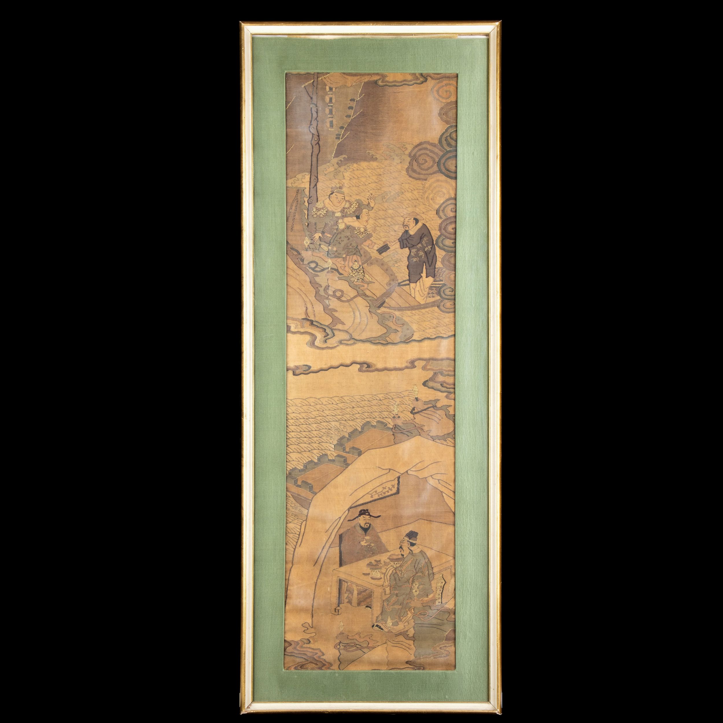 DUE PANNELLI IN SETA KESI CON COMPOSIZIONI DI FIGURE NEL PAESAGGIOCina, dinastia Qing, XIX secoloCornice in legno e vetro protettivo.108 x 8 cm ognuno (cornice inclusa)Provenienza: collezione privata italiana.