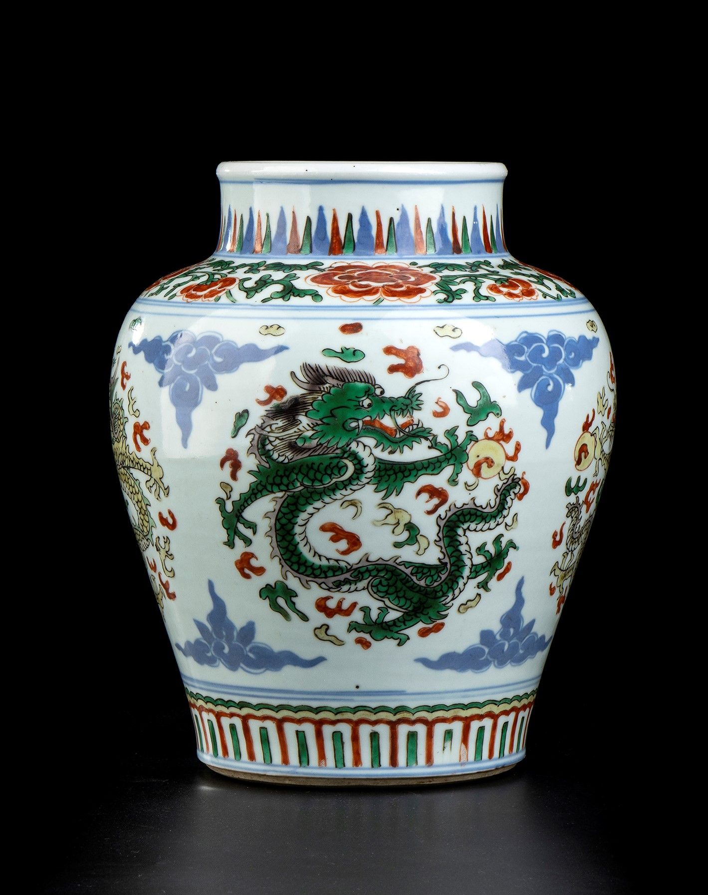 L'esterno del corpo con un decoro di draghi all'inseguimento della perla in volo tra nuvole e dardi fiammeggianti.
