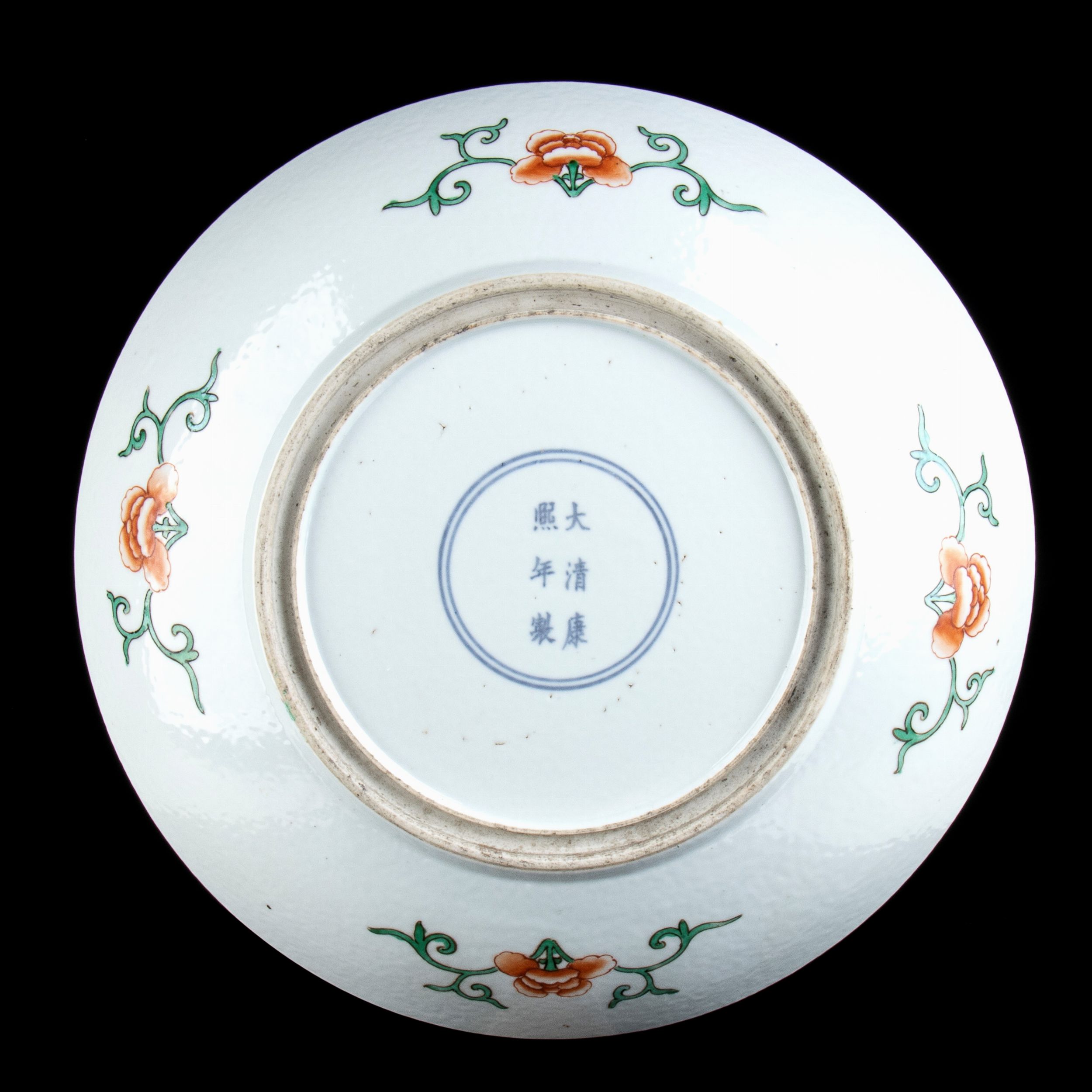 GRANDE PIATTO IN PORCELLANA 'FAMIGLIA VERDE'Cina, XX secoloMarchio apocrifo di Kangxi al centro della base.6,5 x 36,5 cmProvenienza: collezione privata italiana.