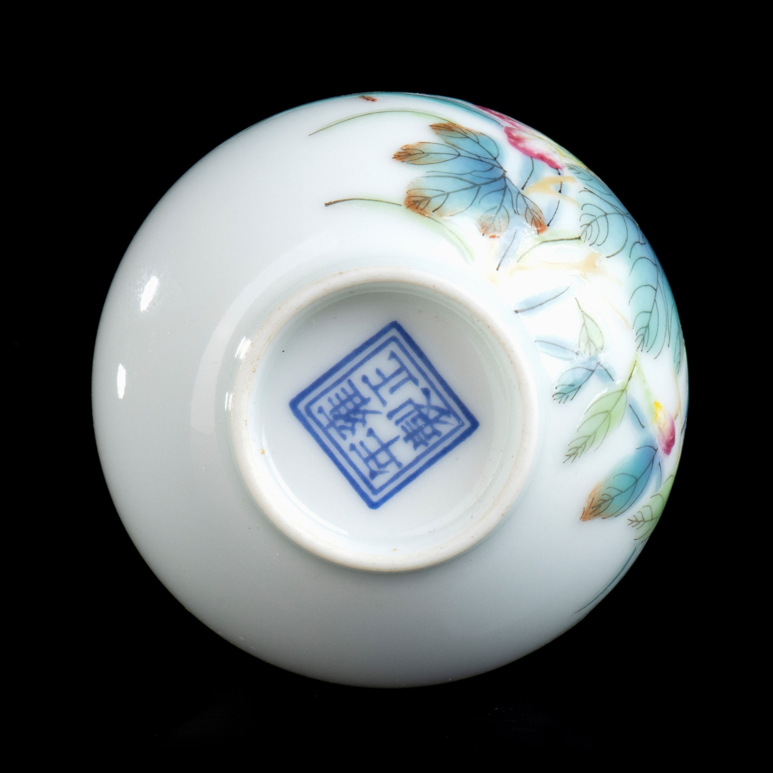 Decorato con una composizione floreale e iscrizione, marchio apocrifo di Yongzheng al centro della base.