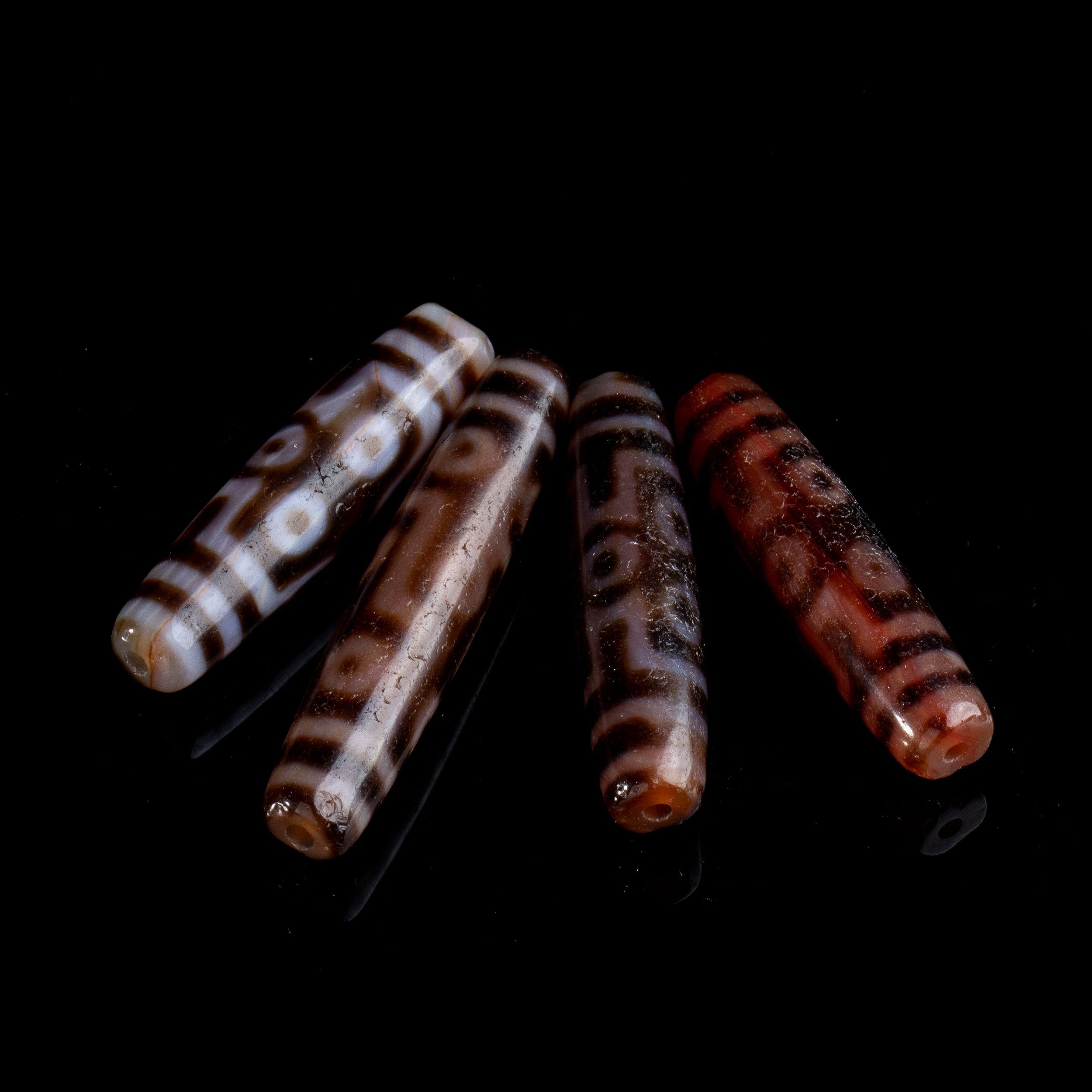UNA COLLANA IN VETRO E ARGENTO, QUATTRO DZI E DUE OGGETTI IN GIADA