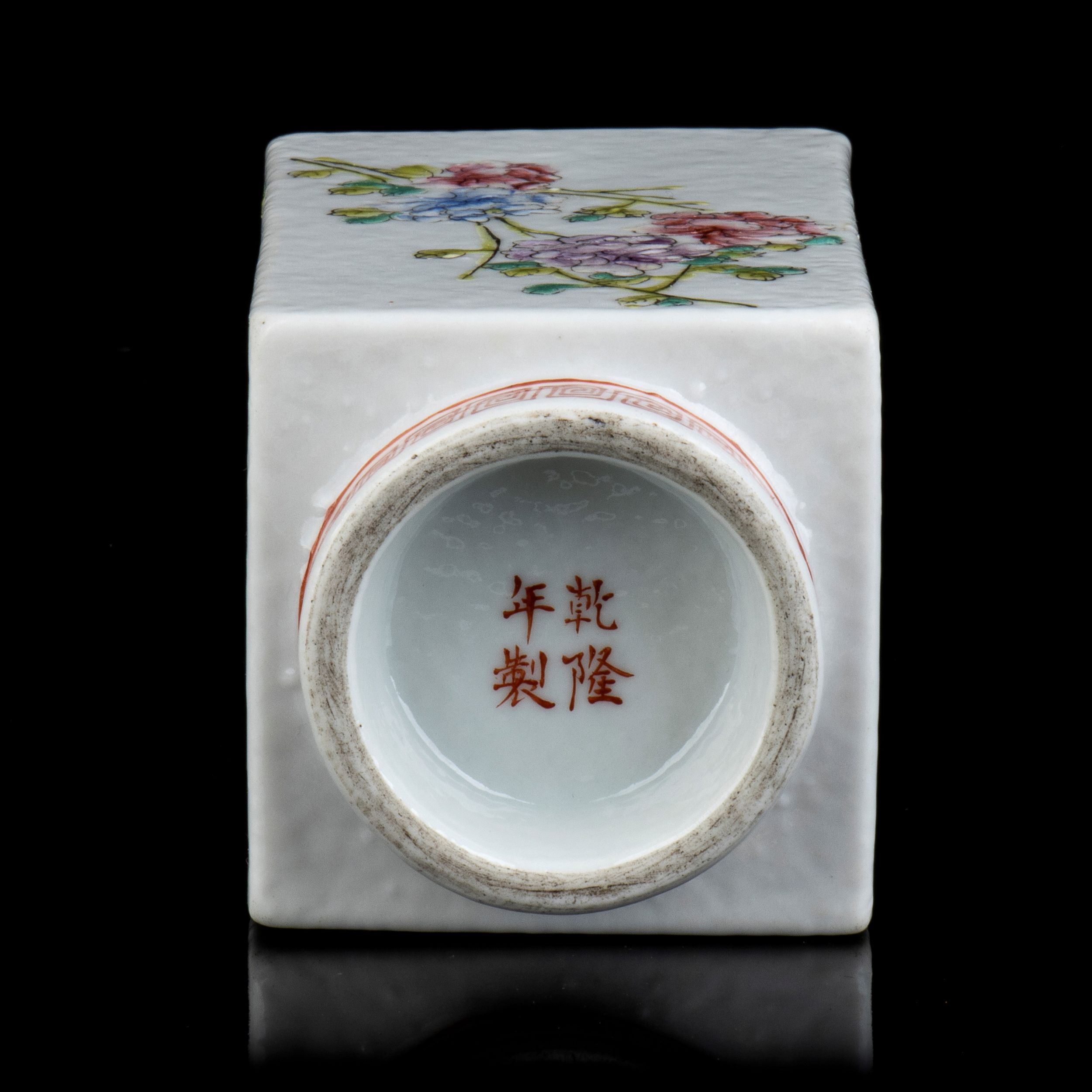 VASO A SEZIONE QUADRATA IN PORCELLANA CON DECORO A SMALTI POLICROMICina, XX secoloMarchio apocrifo di Qianlong al centro della base.15 x 7 x 7 cmProvenienza: collezione privata italiana.
