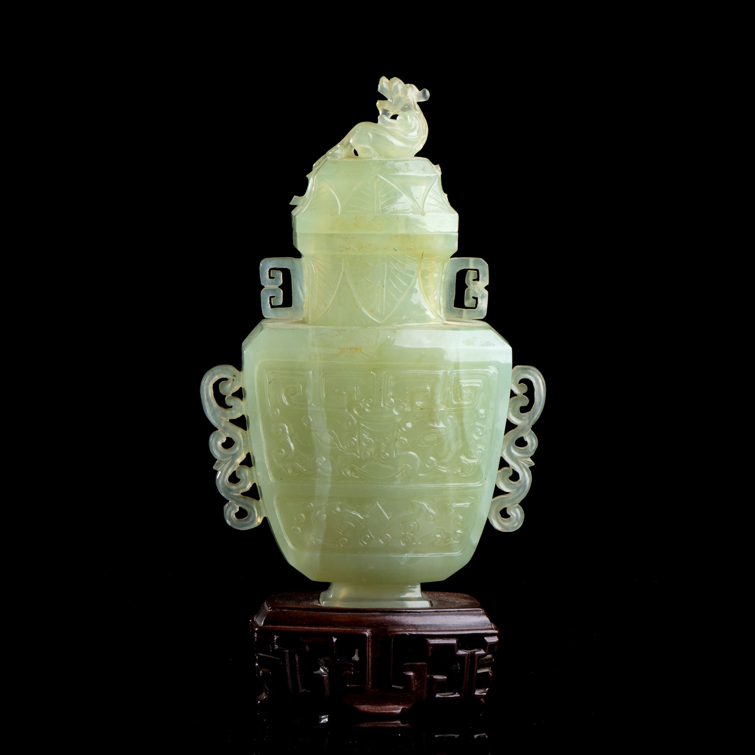 VASO CON COPERCHIO IN PIETRA VERDECina, XX secoloBase in legno incollata.18,5 x 9,5 x 6 cmProvenienza: collezione privata italiana.