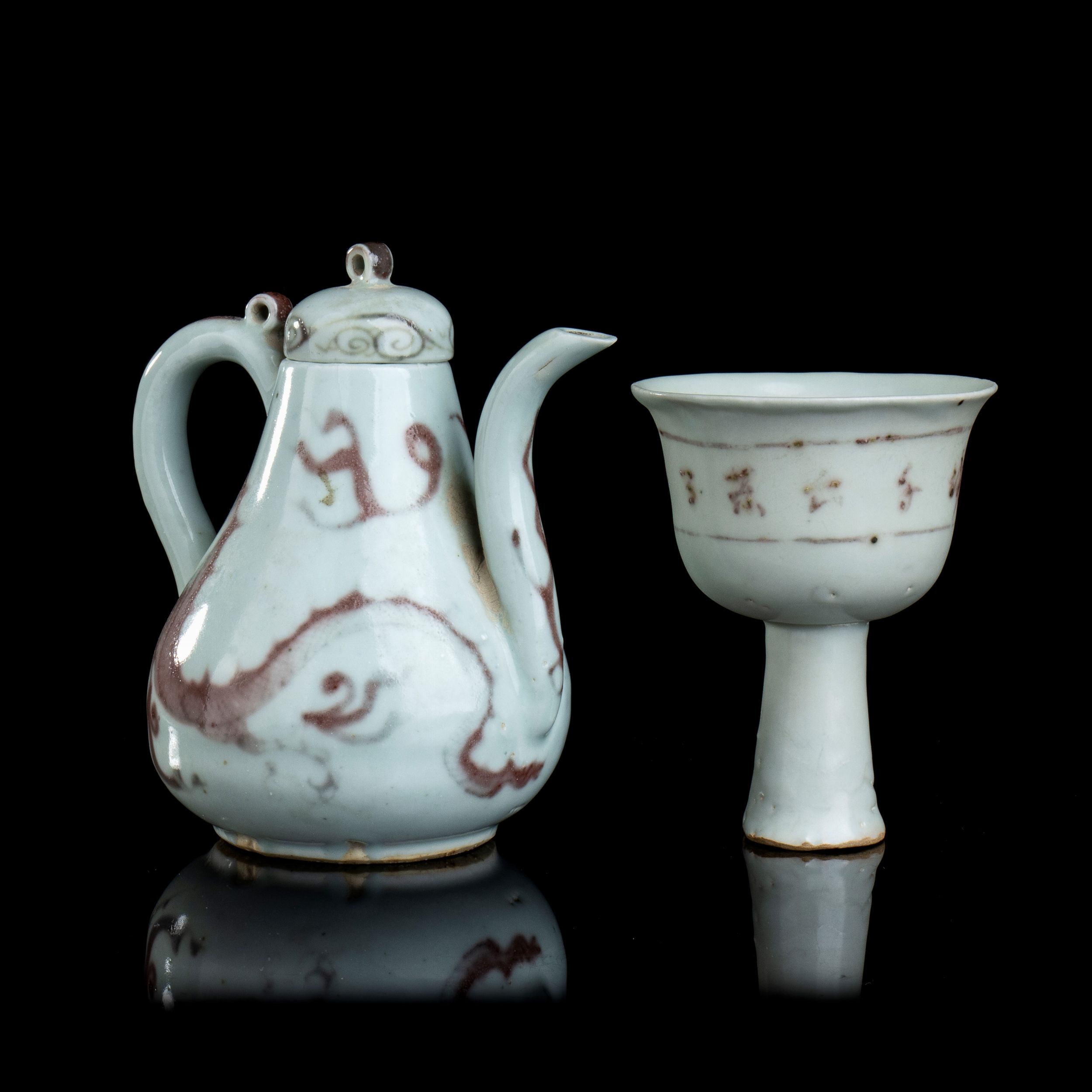VERSATOIO CON COPERCHIO E COPPA A STELO IN PORCELLANA CON DECORO IN ROSSO DI RAME