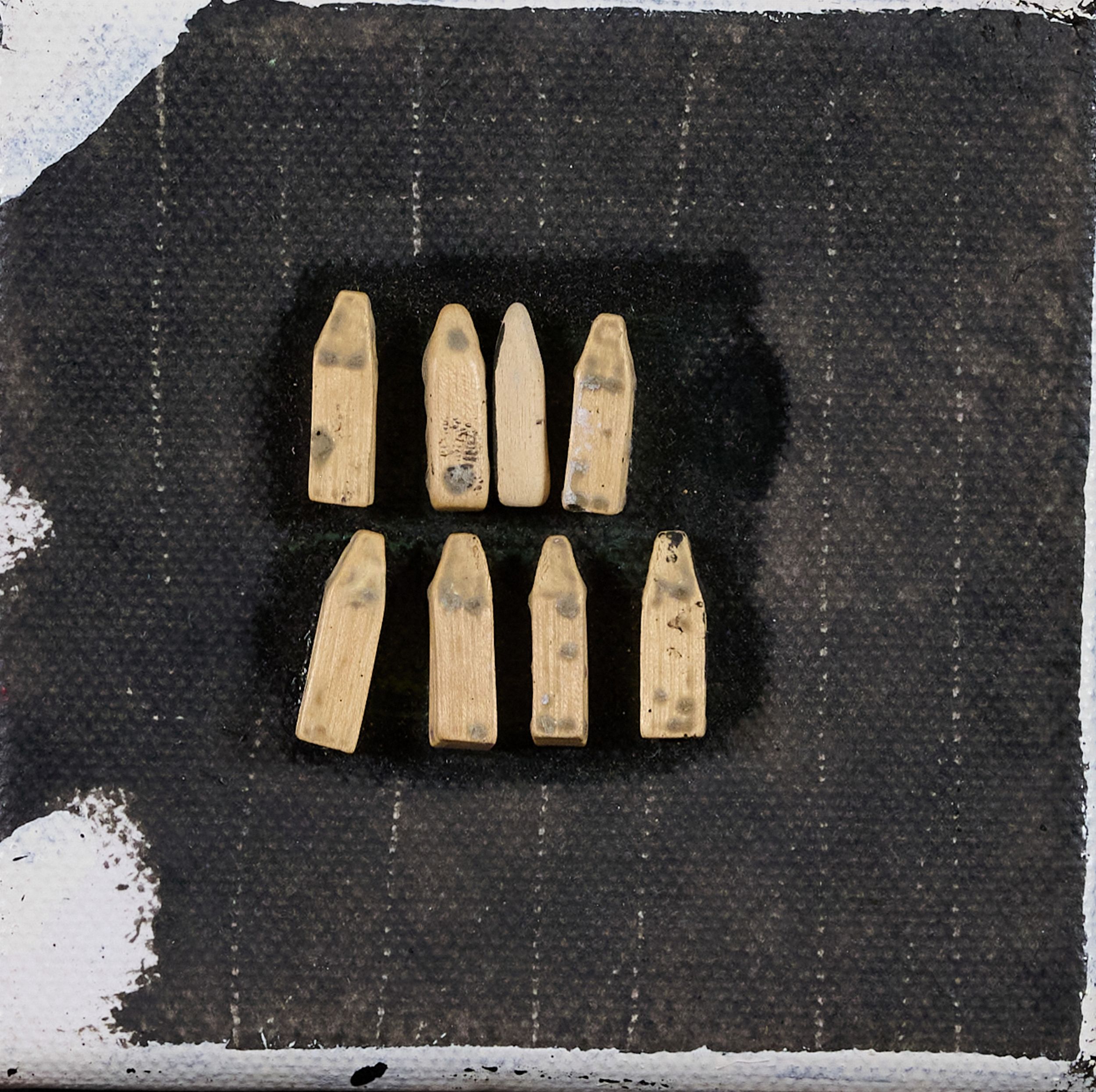 Olio con applicazioni in legno su tela, cm. 10x10x1,5
