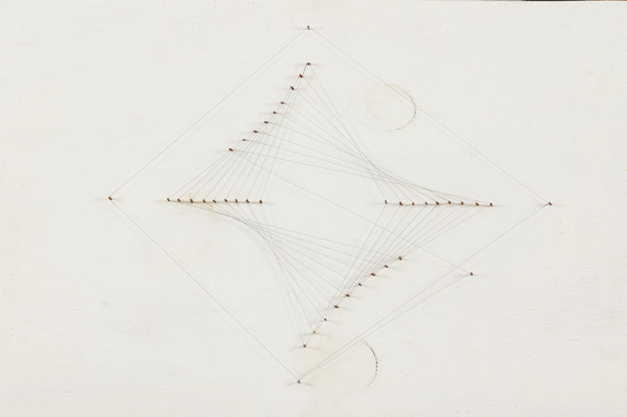 Chiodi e fili su tavola dipinta, cm. 40x60