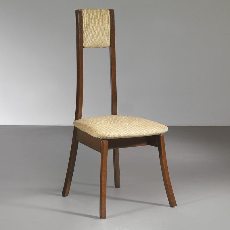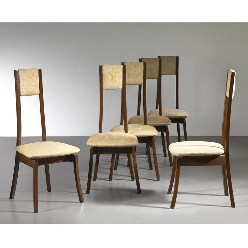 Angelo Mangiarotti (Milano, 1921 - 2012) SEI SEDIE PROGRAM S11 struttura in legno, seduta imbottita e rivestita in tessuto nei toni del beige Produzione Sorgente del Mobile, Italia, 1970 circa cm H100xL42xP7