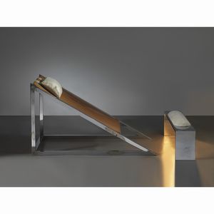 Archizoom POLTRONA CON POGGIAPIEDI MODELLO MIES in legno con seduta in stoffa nei toni del beige Produzione Poltronova, [..]