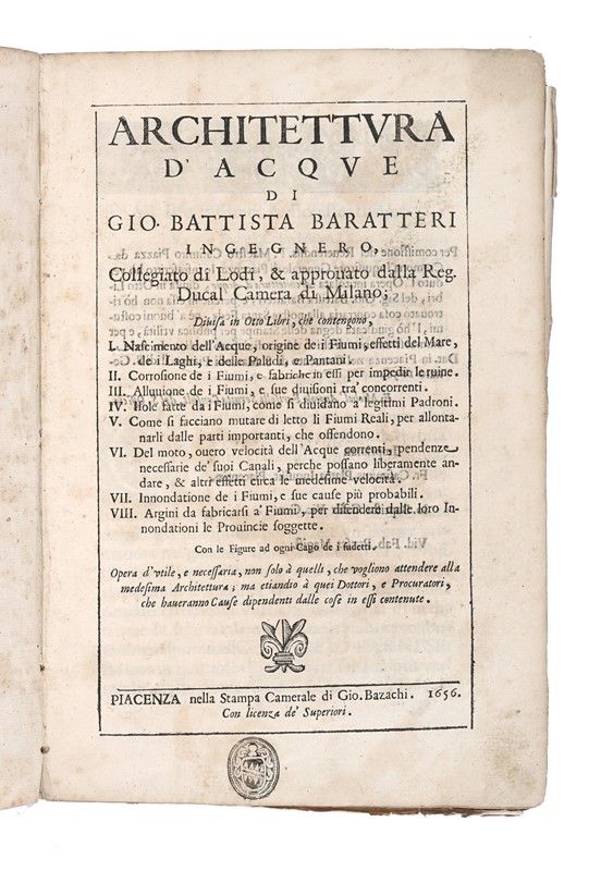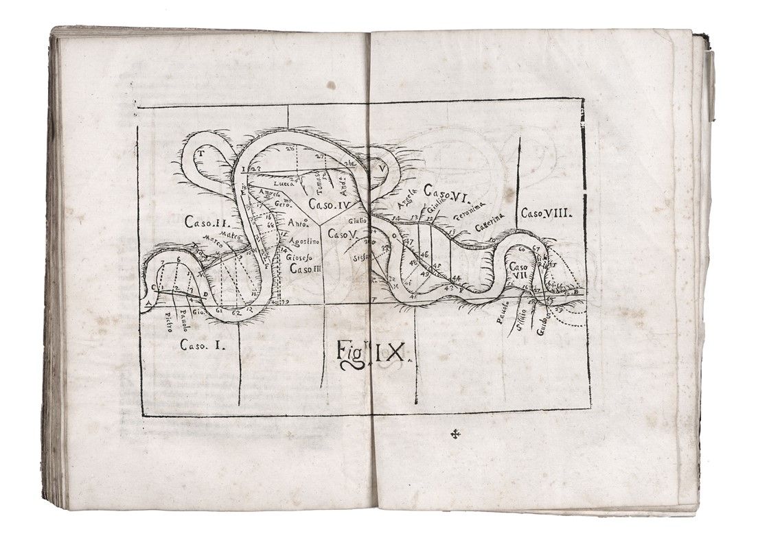 In-folio (mm 290x195). Pagine [20], 277, [3]. Con numerose figure in legno nel testo, anche a piena e doppia pagina, raffiguranti fiumi e corsi d'acqua, schemi e diagrammi e 1 tavola xilografica a doppia pagina fuori testo. Cornice tipografica ai frontespizi, capilettera, testatine e finalini incisi in legno. Fioriture e bruniture sparse; alcuni fascicoli allentati. Legatura in cartonato rustico coevo, con gravi mancanze al dorso e altri difetti. Mancante il secondo volume. Marca di possesso al frontespizio.