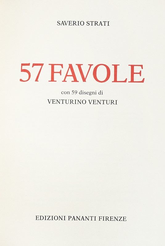 In-folio (mm 490x340). Esemplare profusamente illustrato, con tavole a piena pagina a colori di Venturino Venturi. Legatura in piena tela, con sovraccoperta illustrata. Perfetto stato di conservazione. Esemplare non numerato né firmato, su una tiratura complessiva di 1300 copie. SI AGGIUNGE: Strati Saverio, 57 favole. Con 59 disegni di Venturino Venturi. Firenze: Edizioni Pananti, 1982.