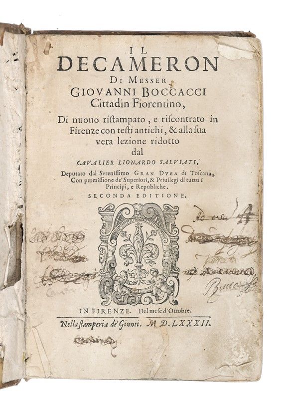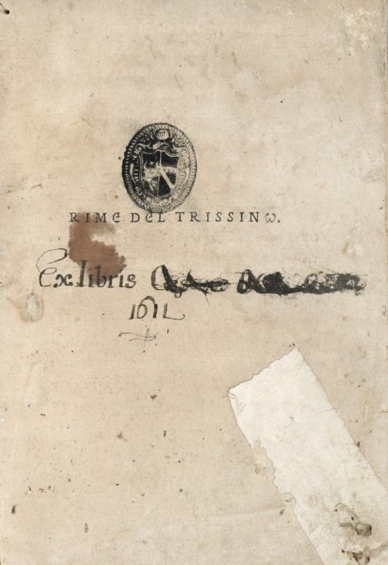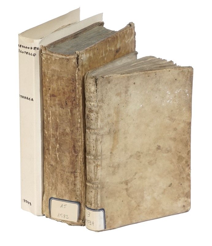 In-4° (mm 207x145). Pagine [32], 585, [77]. Copia tarlata nel margine inferiore delle carte della prima metà del volume (tarlo restaurato in corrispondenza di frontespizio e primi fascicoli di testo), strappo nel margine superiore di carta y4, altri forellini di tarlo nelle ultime carte di testo, leggera gora marginale nei margine esterno delle carte. Legatura in piena pergamena con titolo su falso tassello al dorso (parzialmente sbiadita). Legatura parzialmente staccata. Note di possesso cassate al frontespizio. SI AGGIUNGE: Petrarca Francesco, Il Petrarca con l'espositione di m. Alessandro Vellutello. In Venetia: apresso Gio. Antonio Bertano, 1573. Copia priva di legatura, con difetti, da controllare. SI AGGIUNGE: Trissino Giovan Giorgio, Rime. (Al colophon:) Stampata in Vicenza: per Tolomeo Ianiculo, 1529. Copia con difetti, da controllare.