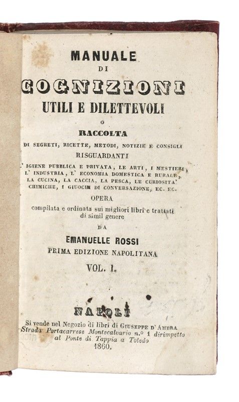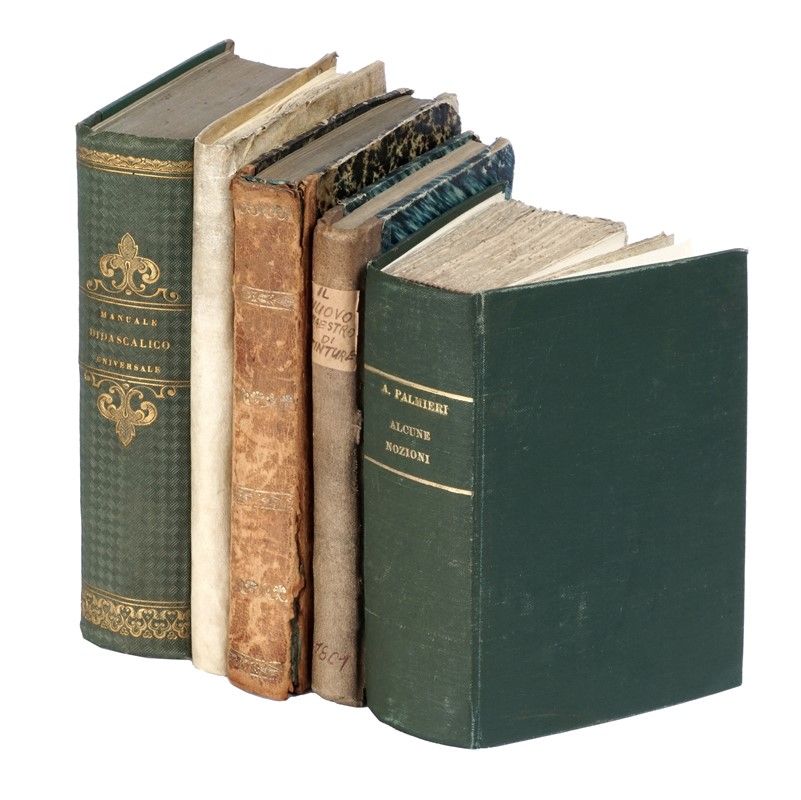Compongono il lotto: 1) Polibio Alembert, L'indispensabile a tutti. Emporio di nozioni, ricette e consigli di igiene, medicina pratica… Milano: Bietti, s.d. 2) Il nuovo maestro d'ogni sorte di tinture. Milano: Agnelli, 1818. 3) Enciclopedia tascabile. Repertorio di cognizioni utili per tutti… III edizione. Firenze: Bemporad, s.d. 4) Enciclopedia tascabile. Repertorio di cognizioni utili per tutti… IX edizione. Firenze: Bemporad, s.d. 5) G. Battista Baccioni, Per la casa e per l'industria. Ricette e cognizioni utili a tutti. Firenze: Adriano Salani, s.d. 6) Jean D'Albret, Il ricettario delle famiglie. Libro d'oro per tutti. Torino: la Scienza del Popolo, 1931. 7) Il libro per tutti. Repertorio di cognizioni utili nelle diverse occorrenze della vita domestica… Firenze: G. Barbèra, 1891. 8) Il nuovo maestro d'ogni sorta di tinture. Milano: Sirtori, 1801. 9) Osservazioni chimiche sull'arte di levare le macchie dalle stoffe e di ristabilirne i colori alterati… Milano: per Cairo e Comp., 1807. 10) Manuale didascalico universale ossia insegnamento elementare… Seconda edizione. Prato: tip. Aldina, 1852. 11) Manuale di cognizioni utili e dilettevoli o raccolta… Vol I (-III). Napoli: Giuseppe d'Ambra, 1860. 3 volumi. 12) Il nuovo maestro d'ogni sorte di tinture. In Milano: Sirtori, 1788. 13) Manuale di cognizioni utili e dilettevoli o raccolta… Firenze: Giacomo Moro, 1857. 14) Alcune nozioni di arti industriali mestieri, agricoltura domestica economia. Perugia: Bartelli, s.d. 15) Nozioni di economia domestica. Compendio di ricette pratiche per la smacchiatura, lavaggio, tintura, verniciatura… Pinerolo: Chiantore-Mascarelli, 1926. 16) Ricettario e cognizioni utili. Fascicolo primo (-terzo). Firenze: Salani, s.d.