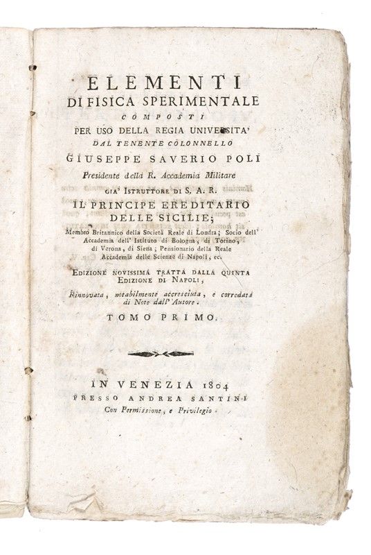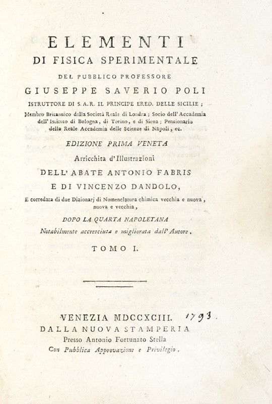 Compongono il lotto: 1) Elementi di fisica sperimentale... In Venezia: Santini, 1804. Tomo I-V. (5 volumi) 2) Elementi di fisica sperimentale... Venezia: Andrea Santini e figlio, 1824. Tomo I-V. (5 tomi in 2 volumi). 3) Elementi di fisica sperimentale... Napoli: 1808. Tomo I-II. (2 volumi). 4) Elementi di fisica sperimentale... Venezia: Tipografia pepoliana, 1793. Tomo I-VI. (6 volumi) 5) Elementi di fisica sperimentale... In Venezia: Tipografia pepoliana, 1796. Tomo I-V. (5 volumi)