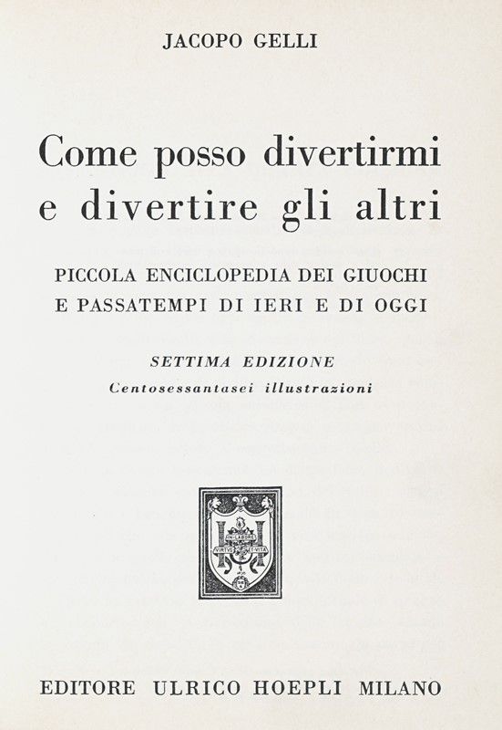 Compongono il lotto: 1) Jacopo Gelli, Giochi e passatempi. Milano: Hoepli, 1979. 2) Toddi, I numeri, questi simpaticoni, ovvero… Milano: Hoepli, 1944. 3) Sagredo, Aneddotica delle scienze Milano: Hoepli, 1948. 4) Nico Barbieri, Enciclopedia ricettario oltre diecimila ricette… Milano: Hoepli, 1951. 5) Arturo Uccelli, Storia della tecnica dal medioevo ai nostri giorni. Milano: Hoepli, s.d.