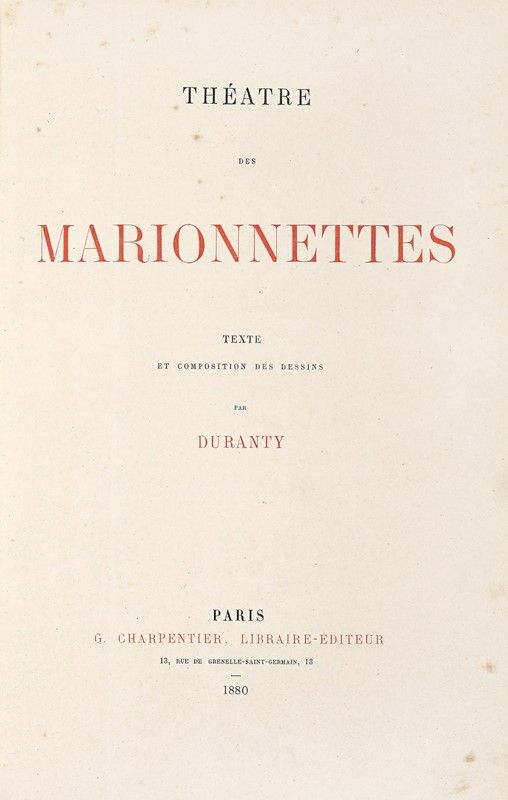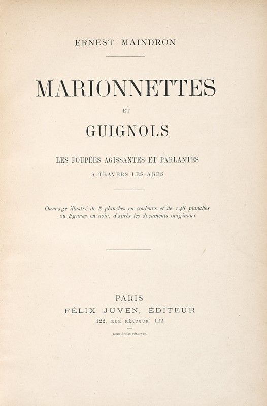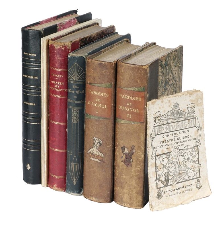 Compongono il lotto: 1) Parodies de Guignol. Repertoires… Illustrations de A.F BONNARDEL. Tome premier (-second). Lyon: Cumin & Masson, Editeurs, 1911. (2 voll.) 2) Herm. Siegfr. Rehm., Das Buch der Marionetten… Berlin: Ernst Frensdorff, s.d. 3) Duranty, Théatre des marionnettes… Paris: G. Charpentier, 1880. 4) De Graffigny, Construction du Théatre Guignol … Paris: Editions André Lesot, s.d. 5) Pierre-Emile Legrand, Guignol et les lyonnaiseries… Préface de Pierre Antoine Perrod. 6) Ernest Maindron, Marionnettes et Guignols… Paris: Felix Juven, s.d.