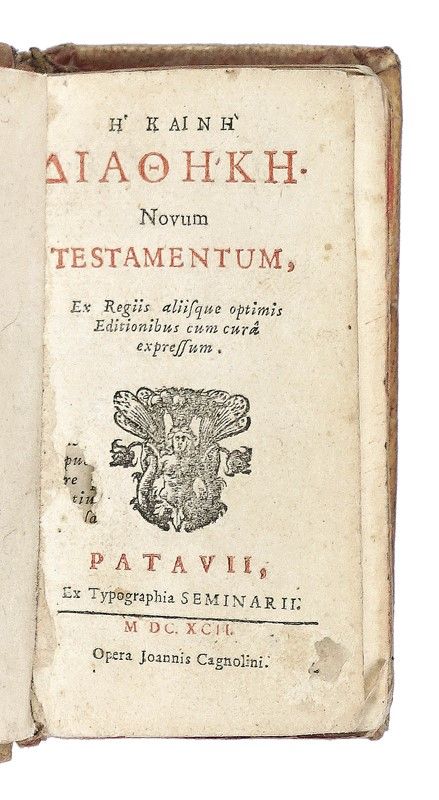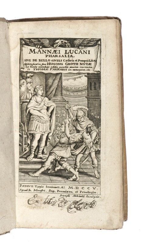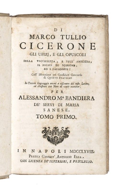 Compongono il lotto: 1) E'Kaine Diatheke, Novum testamentum... Patavii: ex typographia Seminarii, opera Joannis Cagnolini: 1692. 2) Favre Antoine, De Erroribus Pragmaticorum et Interpretum Iuris... Francofurti: ex officina typographica Matthaei Beckeri, 1598. 3) Tacitus Publius Cornelius, Annali et Istorie... In Venezia: appresso Roberto Meglietti, 1616. 4) Anneus Lucanus, Pharsalia... Patavii: apud Io. Manfrè, 1705. 5) Middleton Convers, Storia della vita di M. Tullio Cicerone [...] Tomo primo (-secondo). Napoli: Vincenzo Manfredi, 1762. 2 volumi. 6) Cicero Marcus Tullius, Gli Ufizj, e gli opuscoli sulla vecchiezza, e sull'amicizia, il sogno di Scipione, ed i paradossi... In Napoli: presso Giusepp' Antonio Elia, 1768. Solo il primo volume.
