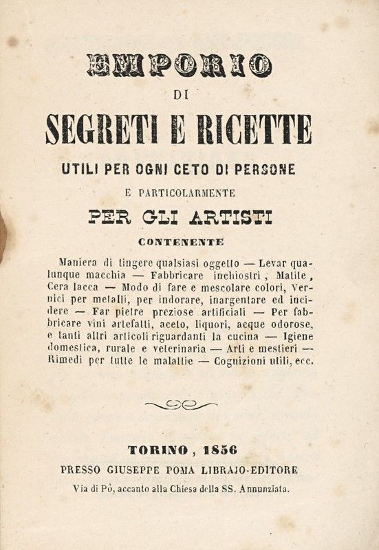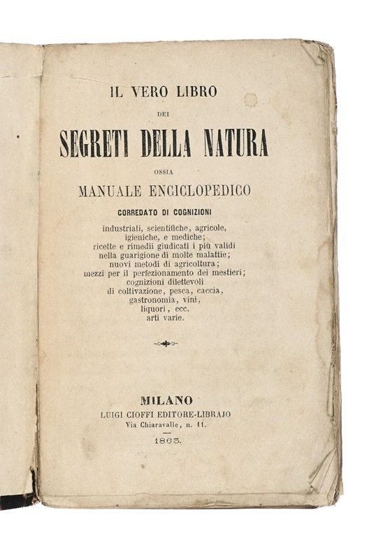 Compongono il lotto: 1) Il vero libro dei segreti della natura ossia manuale enciclopedico… Milano: Wilmant di G. Deitinger e Comp., 1867. 2) Il vero libro dei segreti della natura ossia manuale enciclopedico… Milano: Luigi Cioffi, 1864. (seconda edizione). 3) Il vero libro dei segreti della natura ossia manuale enciclopedico… Milano: Luigi Cioffi, 1863. 4) Il vero libro dei segreti della natura ossia manuale enciclopedico… Milano: Luigi Cioffi, 1864. (terza edizione). 5) Emporio di segreti e ricette utili per ogni ceto di persone e particolarmente per gli artisti… Torino: Giuseppe Poma, 1856. 6) Magazzeno di cose utili ossia raccolta compendiosa di oltre seicento novità, cognizioni, scoperte… Milano: Santo Bravetta, 1840. 7) Nuovissima raccolta delle invenzioni e scoperte utili alle arti ed alle industrie… Roma: Tipografia a. della Casa, 1900.