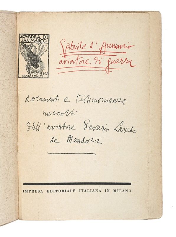 9) Laredo de Mendoza Saverio, Gabriele d'Annunzio aviatore di guerra. Documenti e testimonianze. Milano: Impresa editoriale italiana, 1931.