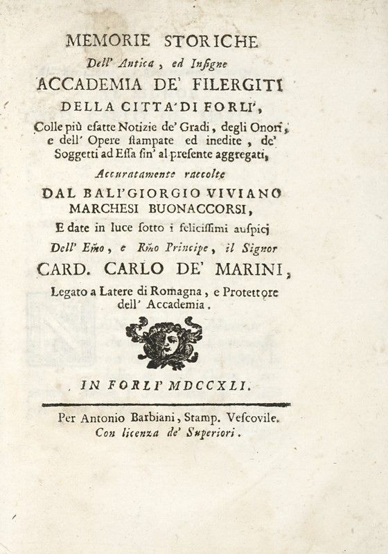 Compongono il lotto: 1) Baldanzi Ferdinando, Della chiesa cattedrale di Prato. Descrizione corredata di notizie storiche e di documenti inediti. Prato: Giachetti, 1846; 2) Cenni storico-artistici per servire di guida ed illustrazione alla insigne basilica di S. Miniato al Monte... Firenze: Baracchi, 1850; 3) Marchesi Giorgio Viviano, Memorie storiche dell'antica, ed insigne Accademia de' Filergiti della citta' di Forlì... In Forlì: per Antonio Barbiani, 1741. Le opere presentano difetti. Lotto non passibile di restituzione.