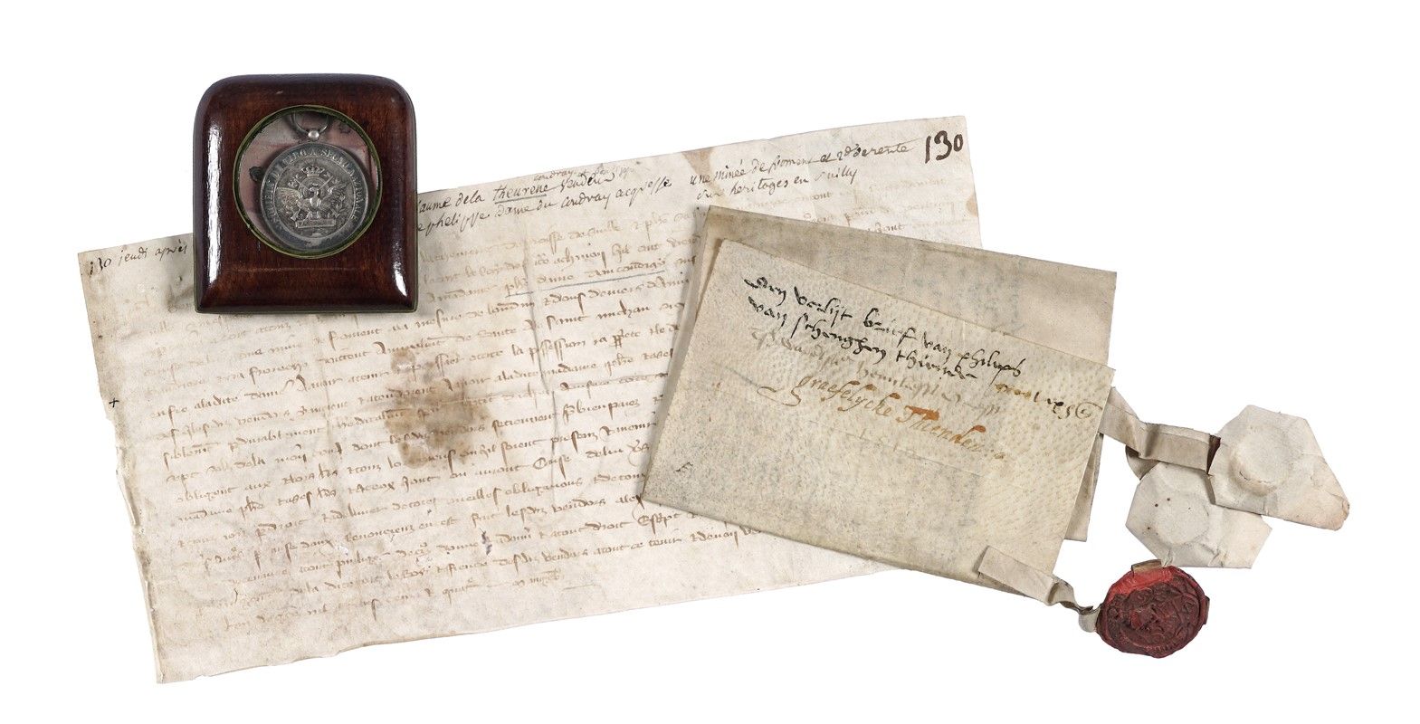 Manoscritti a inchiostro bruno. Testi in francese e tedesco. 2 pergamene con sigilli conservati. Insieme anche 1 documento in carta (XVII secolo), in francese, relativo alla pergamena del 1478. Alcuni difetti. Dimensioni varie.