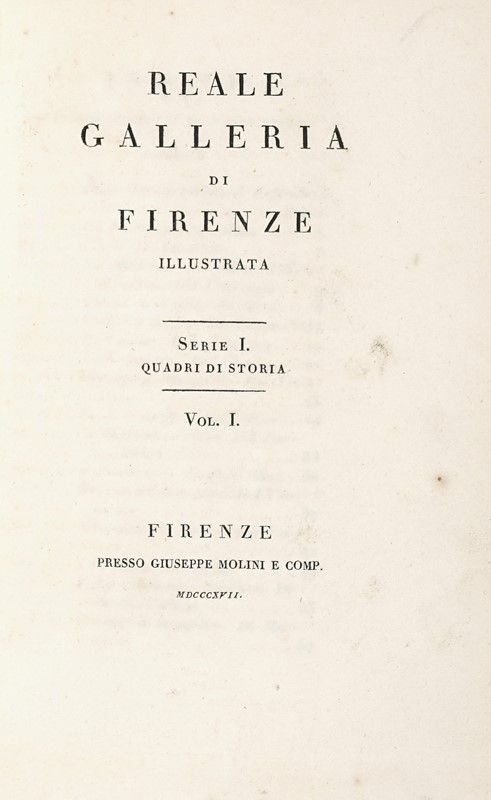 13 volumi in-8° (mm 225x145). Compongono il lotto: 1) Reale Galleria di Firenze illustrata. Serie I. Quadri di storia. Vol. I-III. Firenze: Giuseppe Molini, 1817,1824, 1828; 2) Reale Galleria di Firenze illustrata. Serie II. Quadri di vario genere. Firenze: Giuseppe Molini, 1824; 3) Reale Galleria di Firenze illustrata. Serie III. Ritratti di pittori. Vol. I-IV. Firenze: Giuseppe Molini, 1817, 1820,1821, 1823; 4) Reale Galleria di Firenze illustrata. Serie IV. Statue, bassorilievi, busti e bronzi. Vol. I-III. Firenze: Giuseppe Molini, 1817, 1819, 1824; 5) Reale Galleria di Firenze illustrata. Serie V. Cammei ed intagli. Vol. I-II. Firenze: Giuseppe Molini, 1824-1831. Con numerose tavole calcografiche fuori testo, molte delle quali più volte ripiegate. Fioriture sparse e altre mende. Legatura omogenea in piena tela, con titoli in oro su doppio tassello al dorso. Difetti.