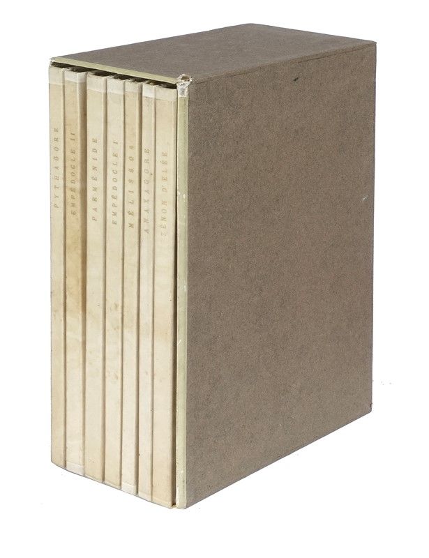 7 volumi in-4° (mm 330x205). Comprende: 1) Pythagoras, Les vers d'or... Paris: Typographie A. Tallone, 1949]; 2) Parménide, De la nature. [Paris, Typographie A. Tallone, 1953]; 3) Empédocle, Le poème des purifications... Paris: Typographie A. Tallone, 1954; 4) Mélissos, Le problème des infinis. Paris: Typographie A. Tallone, 1955; 5) Anaxagore, De la nature. Paris: Typographie A. Tallone, 1956; 6) Zénon d'Elée, De la nature. Alpignano:, Alberto Tallone Éditeur-Imprimeur, 1960; 7) Empédocle, Sur la nature... Alpignano: Alberto Tallone Éditeur-Imprimeur, 1962. Legatura in mezza pergamena, con piatti in cartonato e titoli in oro al dorso; tutti rivestiti in plastica trasparente, entro cofanetto coordinato.