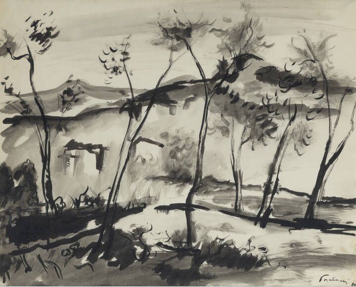 32 5x41 acquerello su carta Opera firmata e datata in basso a destra Già Galleria Quaglino Incontri Torino (etichetta al retro)