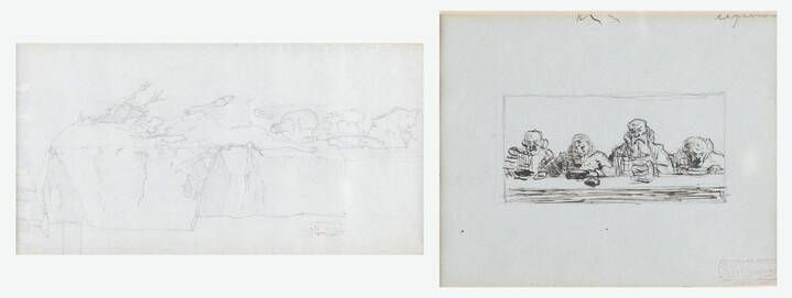A. 11 5x14 5 tecnica mista su carta B. 16x30 matita su carta Esp. : - 1899 Esposizione postuma di Giovan Battista Quadrone (timbro in rosso su ogni disegno)