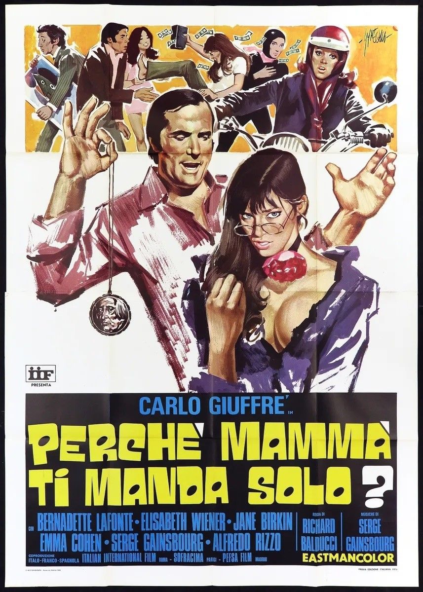1973 Bozzetto originale realizzato da Symeoni per la locandina ufficiale del film Perché mamma ti manda solo?, diretto da Richard Balducci con Jane Birkin e Serge Gainsbourg nel 1973. Firmato.