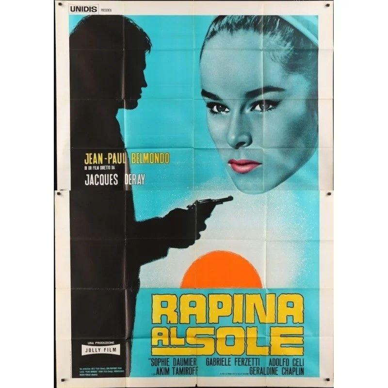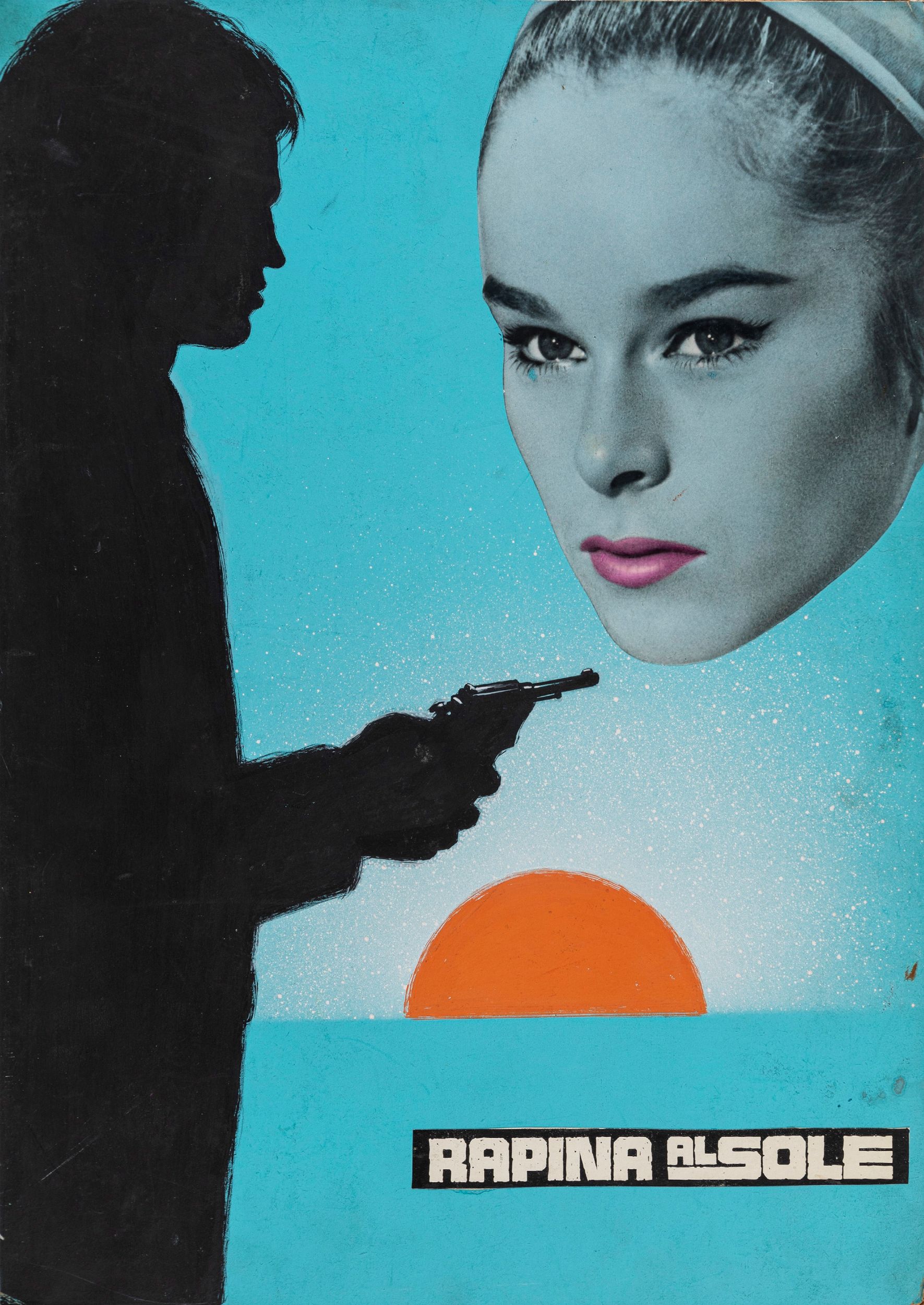 tempera e pellicola fotografica su cartoncino, 24 x 33,5 cm 1965 Bozzetto originale realizzato per la locandina ufficiale del film Rapina al sole, diretto da Jacques Deray con Jean-Paul Belmondo e Sophie Daumier nel 1965. Lievi pieghe agli angoli inferiori.