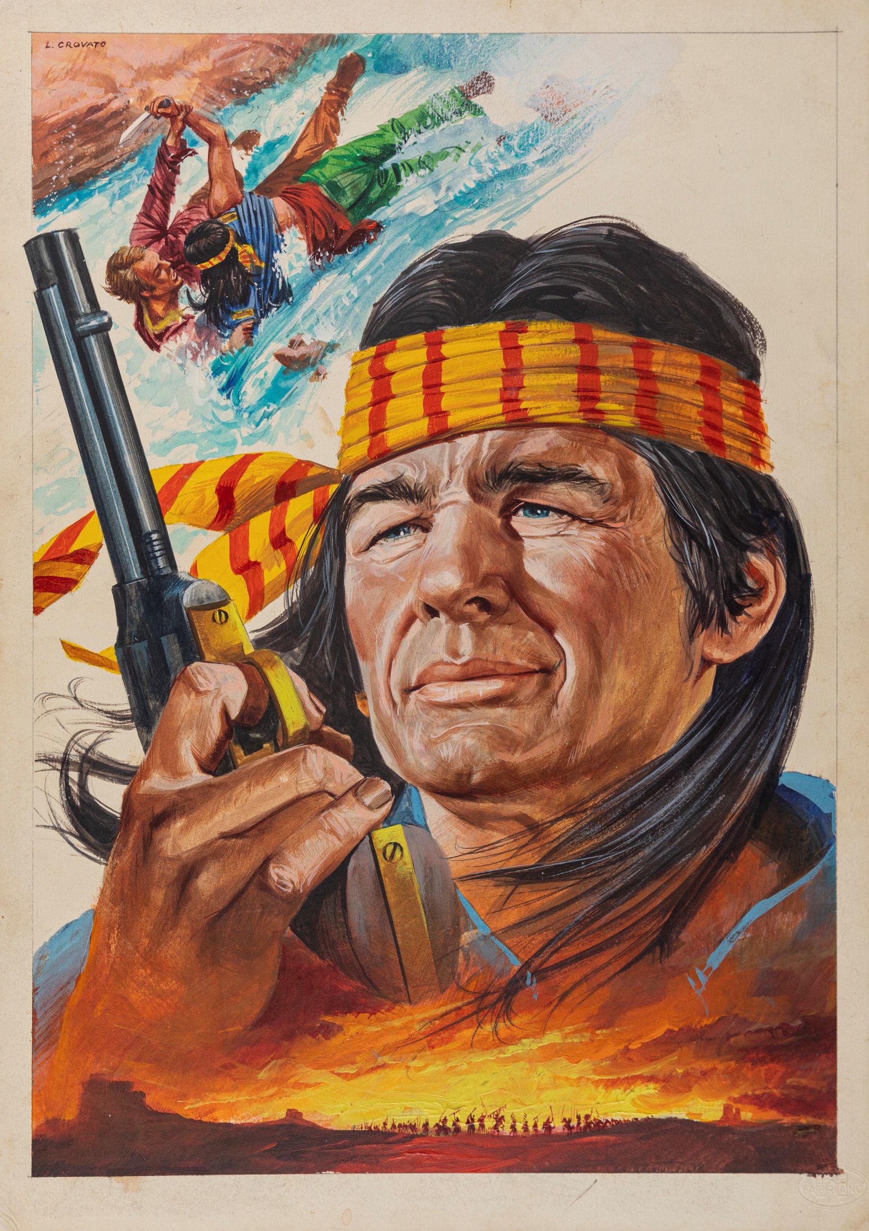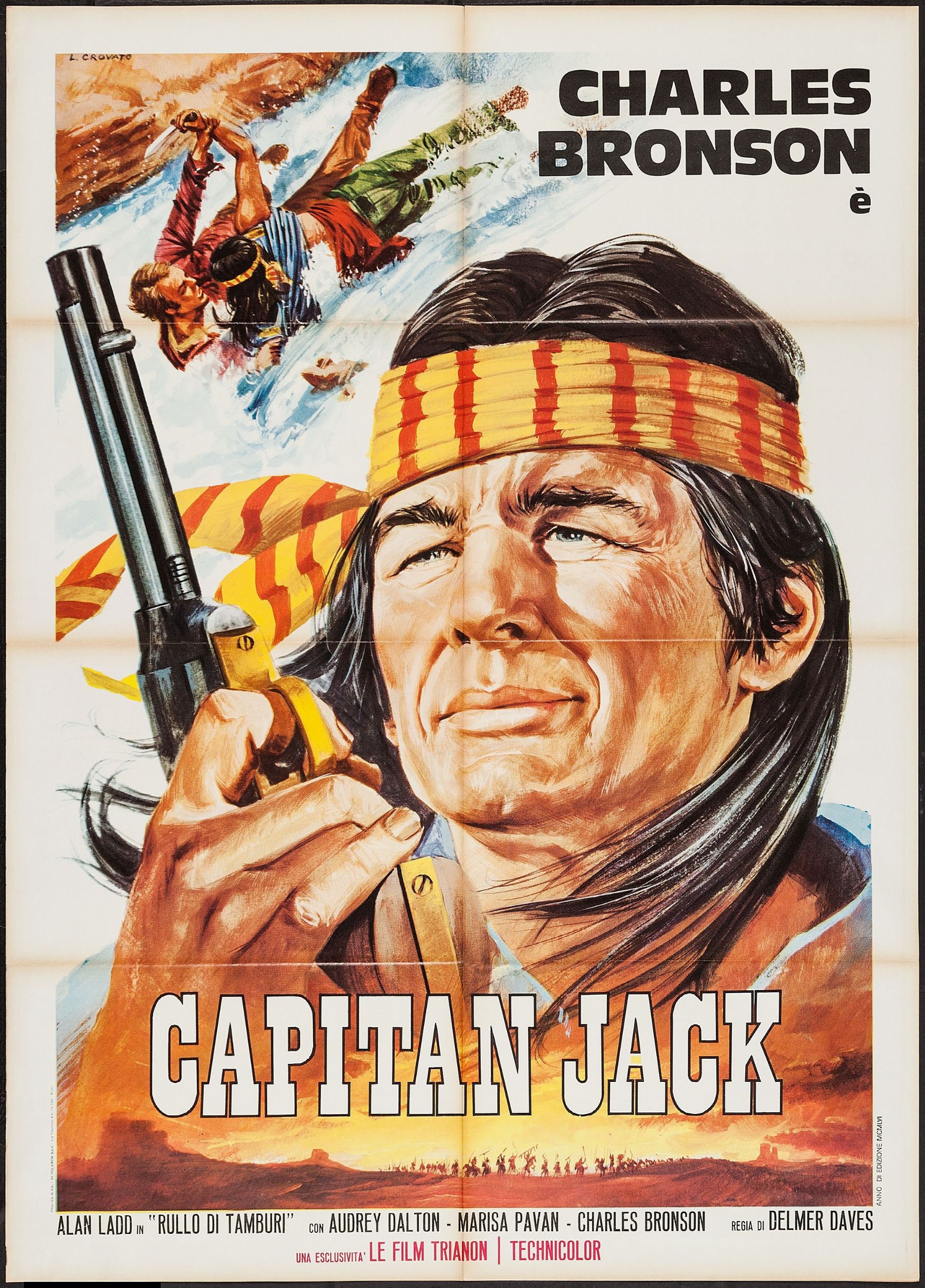 tempera su cartone, 35 x 49,5 cm 1961 Bozzetto originale realizzato da Crovato per la locandina ufficiale del film Rullo di tamburi (riedito in Italia nel 1961 con il titolo Capitan Jack), diretto da Delmer Daves con Alan Ladd e Charles Bronson nel 1954. Lievi pieghe agli angoli inferiori.
