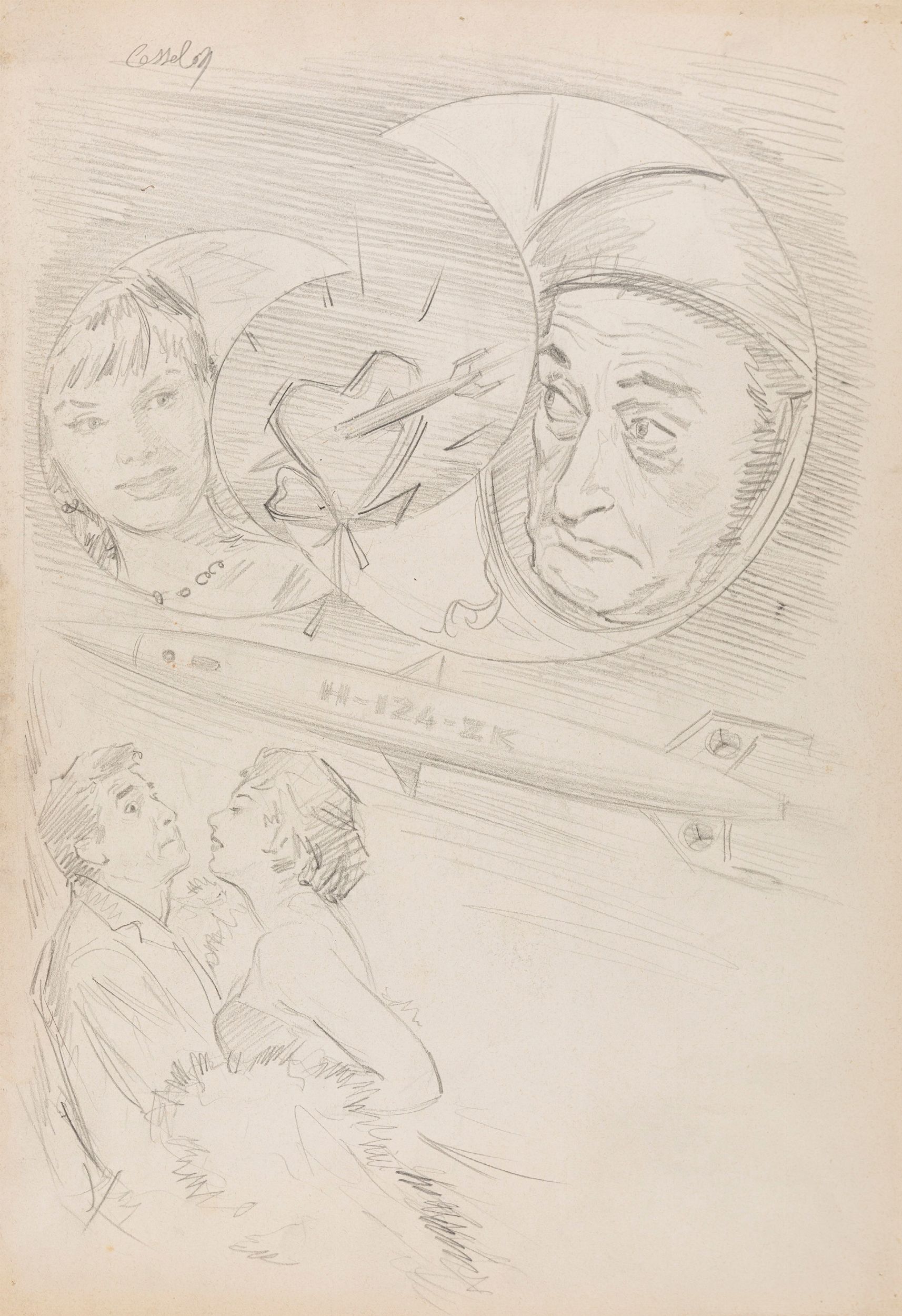 1958 Bozzetto preliminare realizzato da Cesselon per la locandina ufficiale del film Totò nella luna, diretto da Steno con Totò, Sylva Koscina, Ugo Tognazzi e Sandra Milo nel 1958. Fori di affissione agli angoli superiori. Firmato.