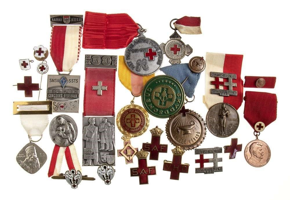CROCE ROSSA - INTERNAZIONALE... LOTTO DI 24 TRA MEDAGLIE E DISTINTIVI DI DIVERSE NAZIINALITA' , TRA CUI DISTINTIVI ROMENI, INGLESI E MEDAGLIE DI VARIE ORGANIZZAZIONI E STATI