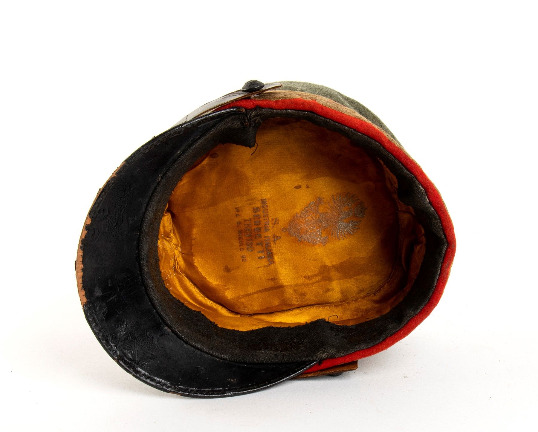 primo quarto XX sec. in panno di lana con greca in ricamo di cotone su panno rosso, aquila in filo, visiera di cuoio nero bordata, interno di cotone, ottimo stato