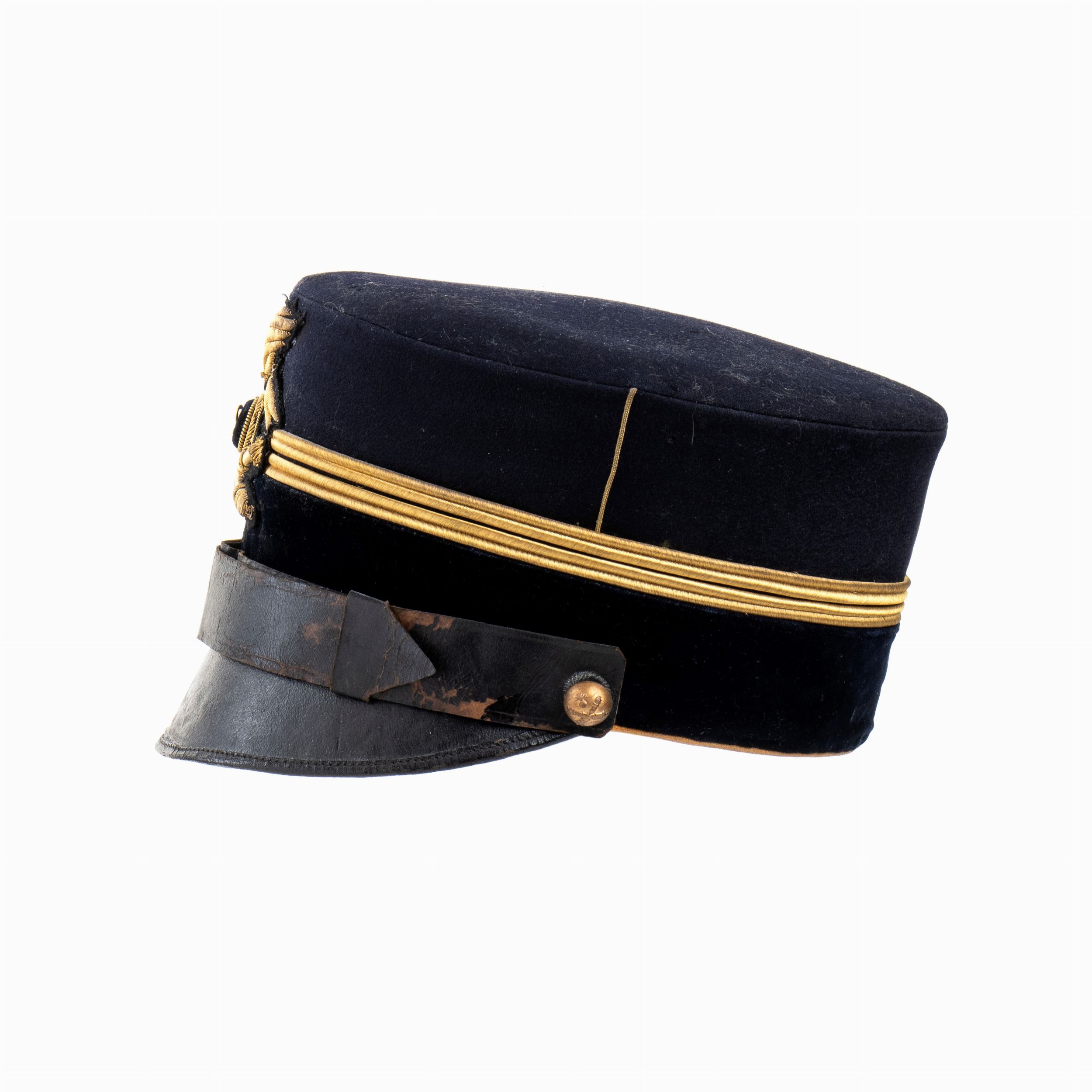 primo quarto XX sec. fusto rigido ricoperto di panno di lana nero filettato giallo arancio, fregio di canottiglia dorata, fodera di seta con marchi del fabbricante, in ottimo stato