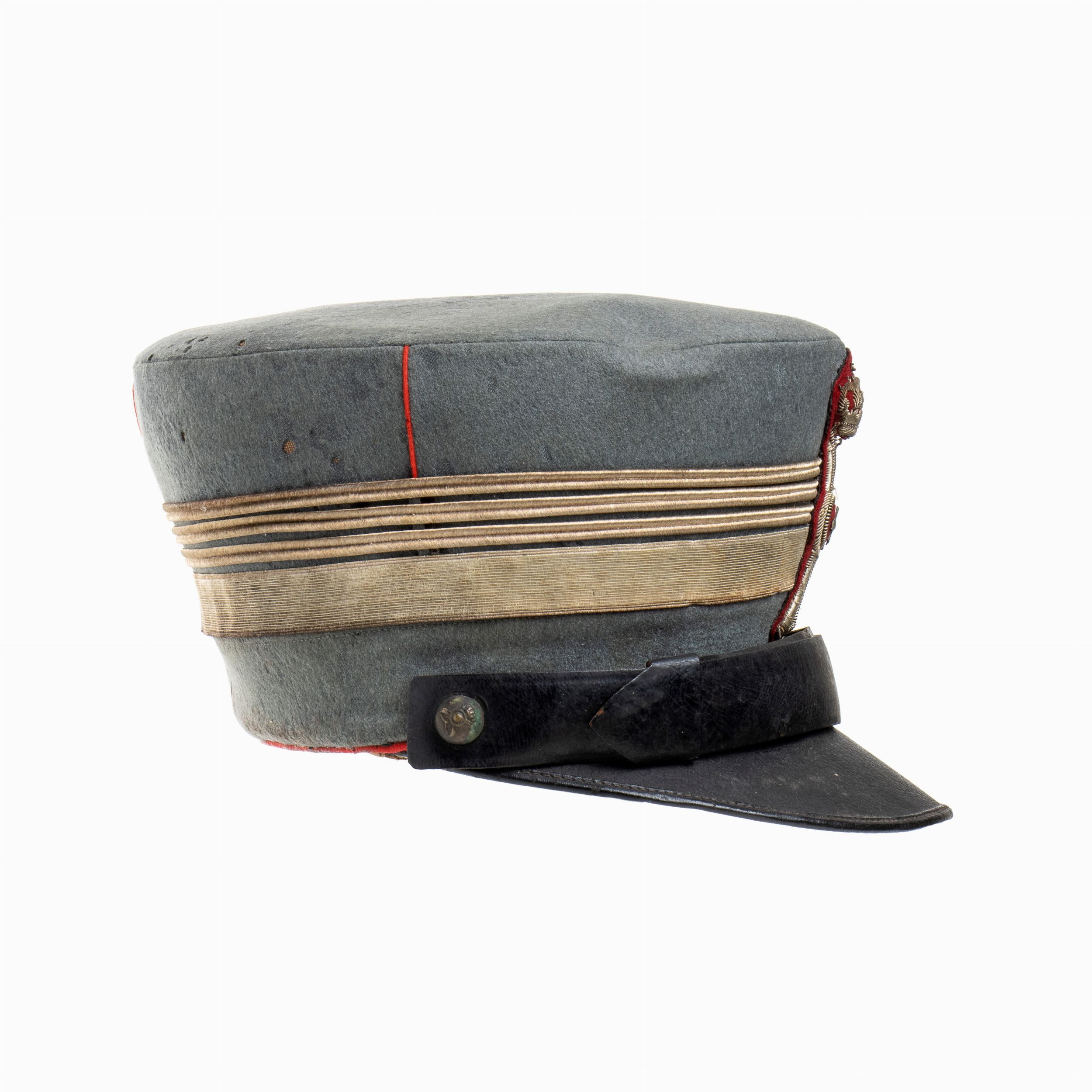 prima metà XX sec. fusto rigido ricoperto con panno di lana grigio verde, fregio e gradi in argento su panno robbio, interno di seta con marchio del fabbricante, in buono stato