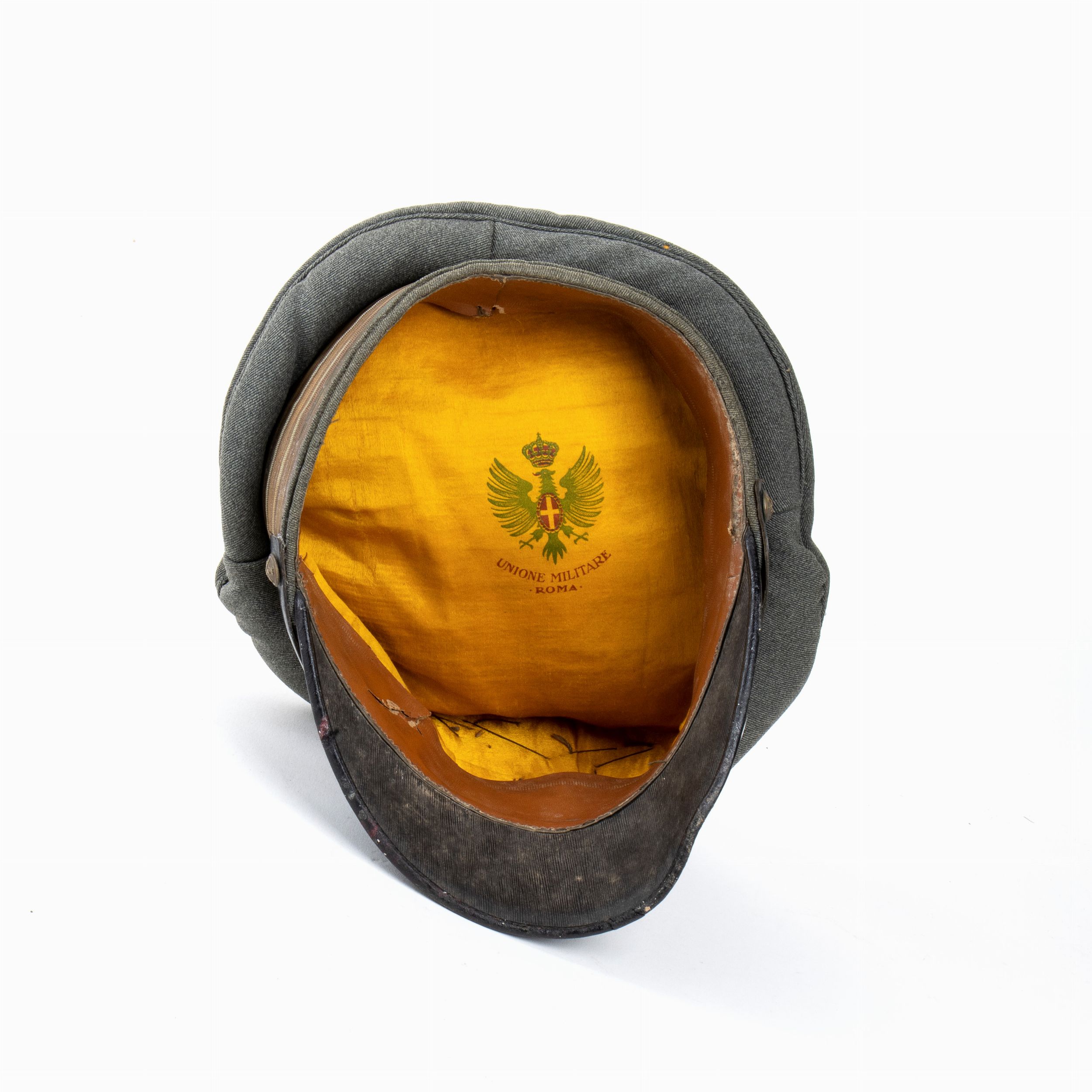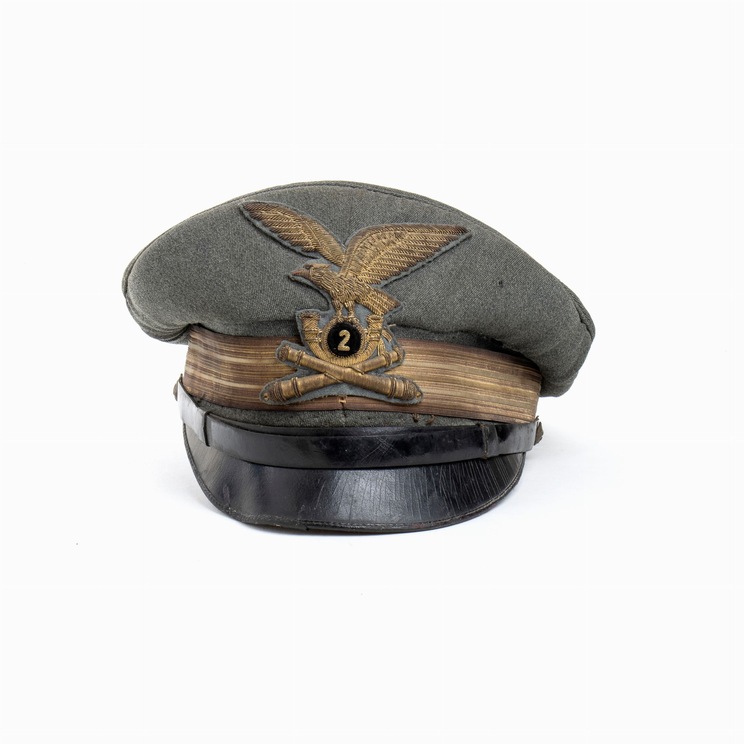 prima metà XX sec. bellissimo berretto di foggia bellica, in gabardin grigio, fregio dell'arma ricamato in canottiglia dorata con spettacolare disegno e di grande formato, all'interno fodera di seta gialla, colore distintivo dell'arma, con marchio del fabbricante
