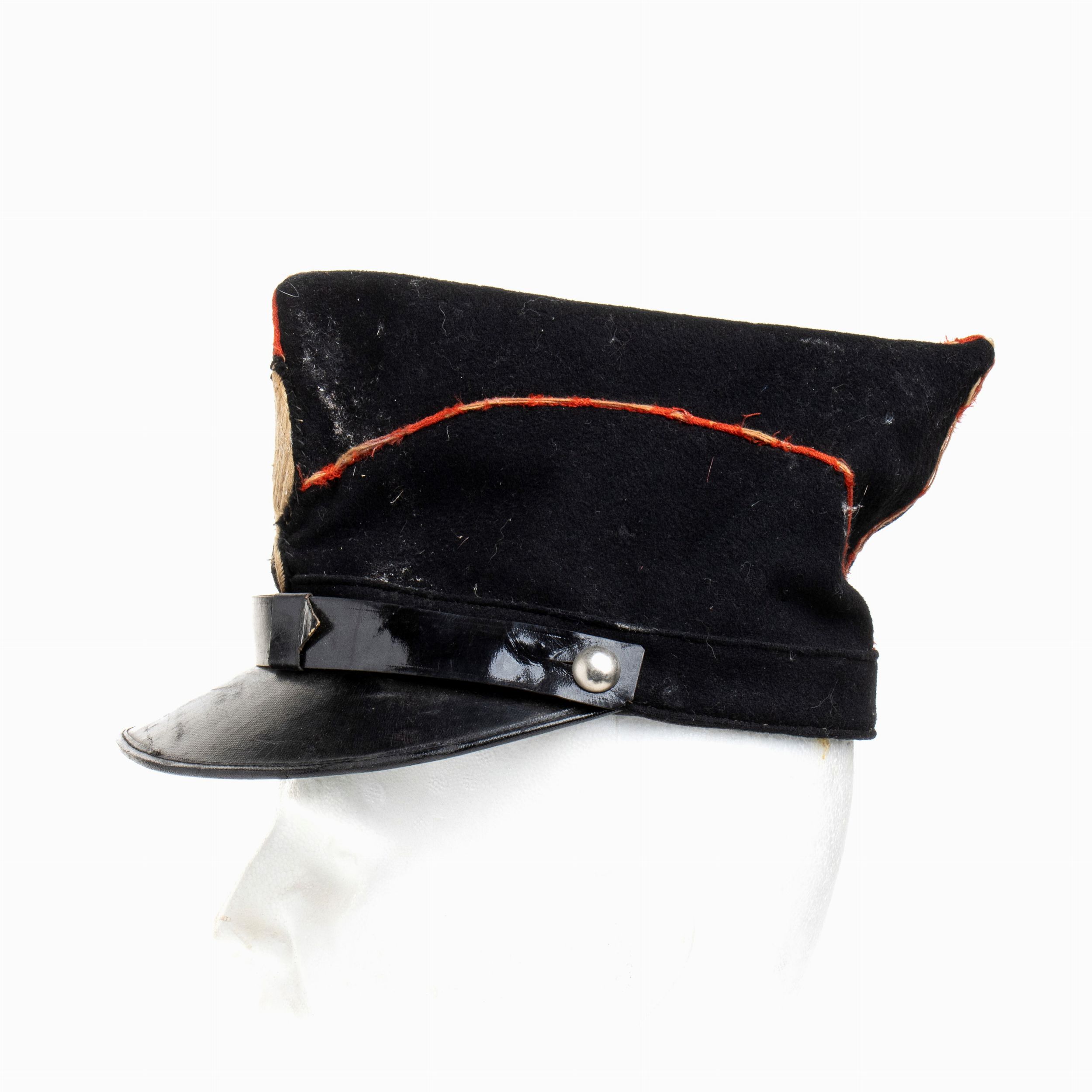 prima metà XX sec. in panno turchino filettato rosso, fregio in cotone bianco, soggolo, interno in tela di cotone, in ottimo stato