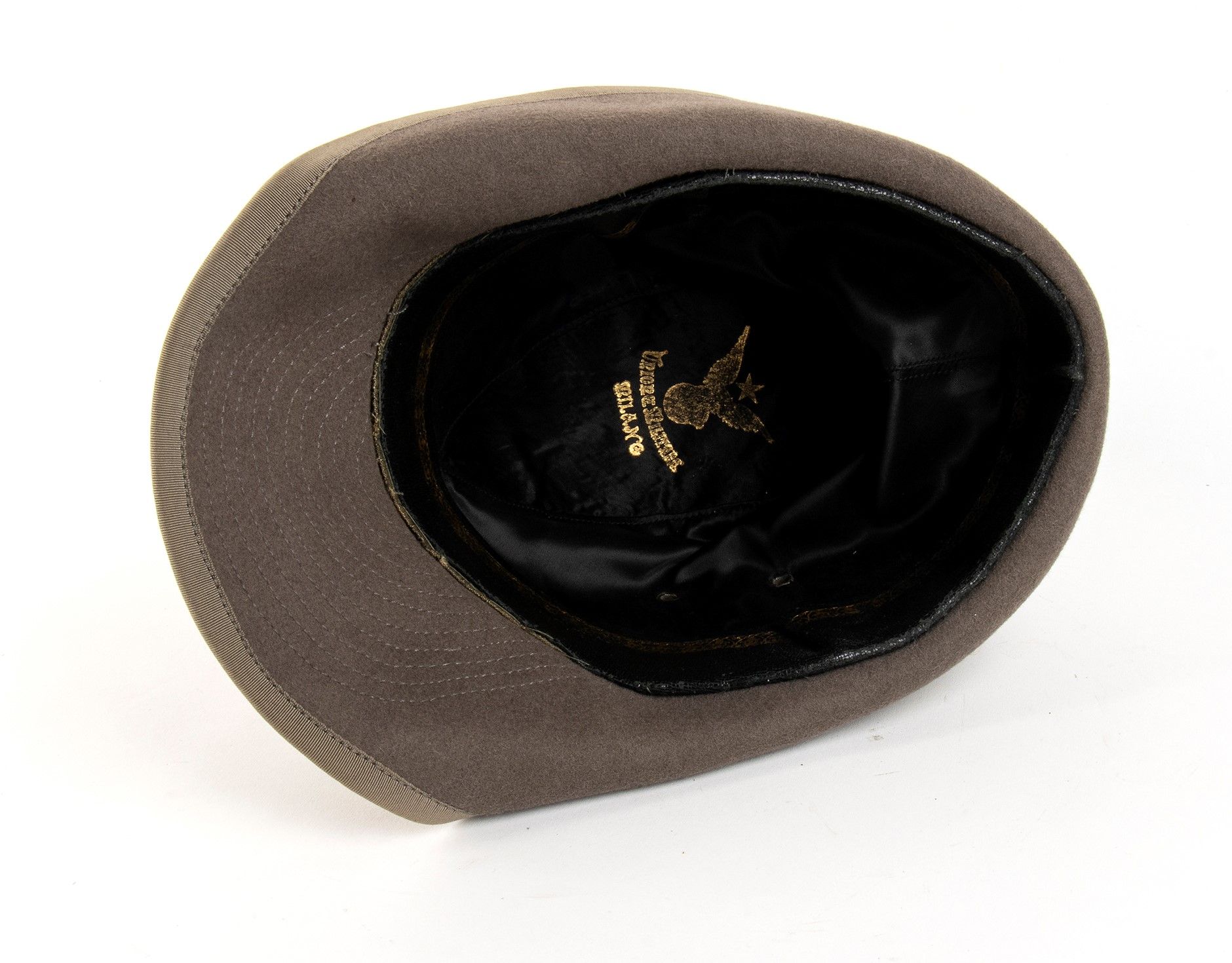primo quarto XX sec. feltro con fascia e bordo in grosgrein grigio, bel fregio di cornetta e corona dei reparti alpini fuori corpo del tipo in uso fino al 1914, interno con fodera del Unione Militare di Milano, alluda in pelle nera con impressioni in oro