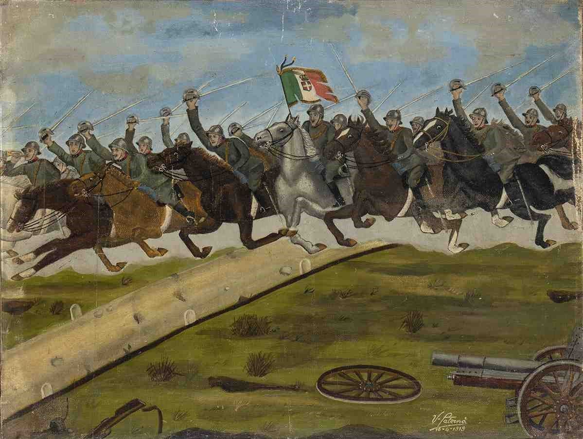 Militaria... olio su tela, 50 x 67 cm, firmato in basso a destra V. Paterna e datato 16-4-1919, difetti (strappi)