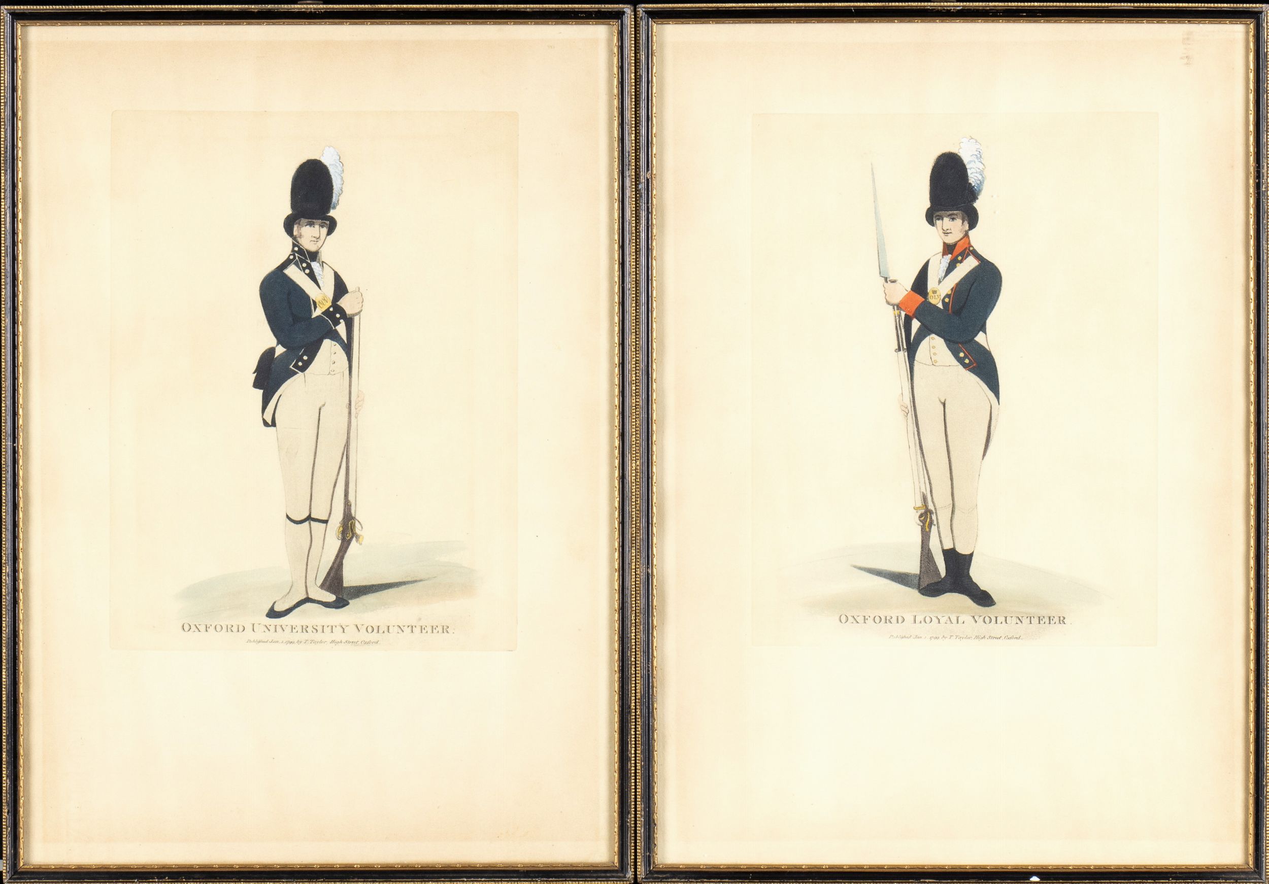 Lotto di due stampe, la prima raffigurante un fante dell' Oxford University Volunteer, la seconda un Oxford Loyal Volunteer con moschetto e baionetta innestata.