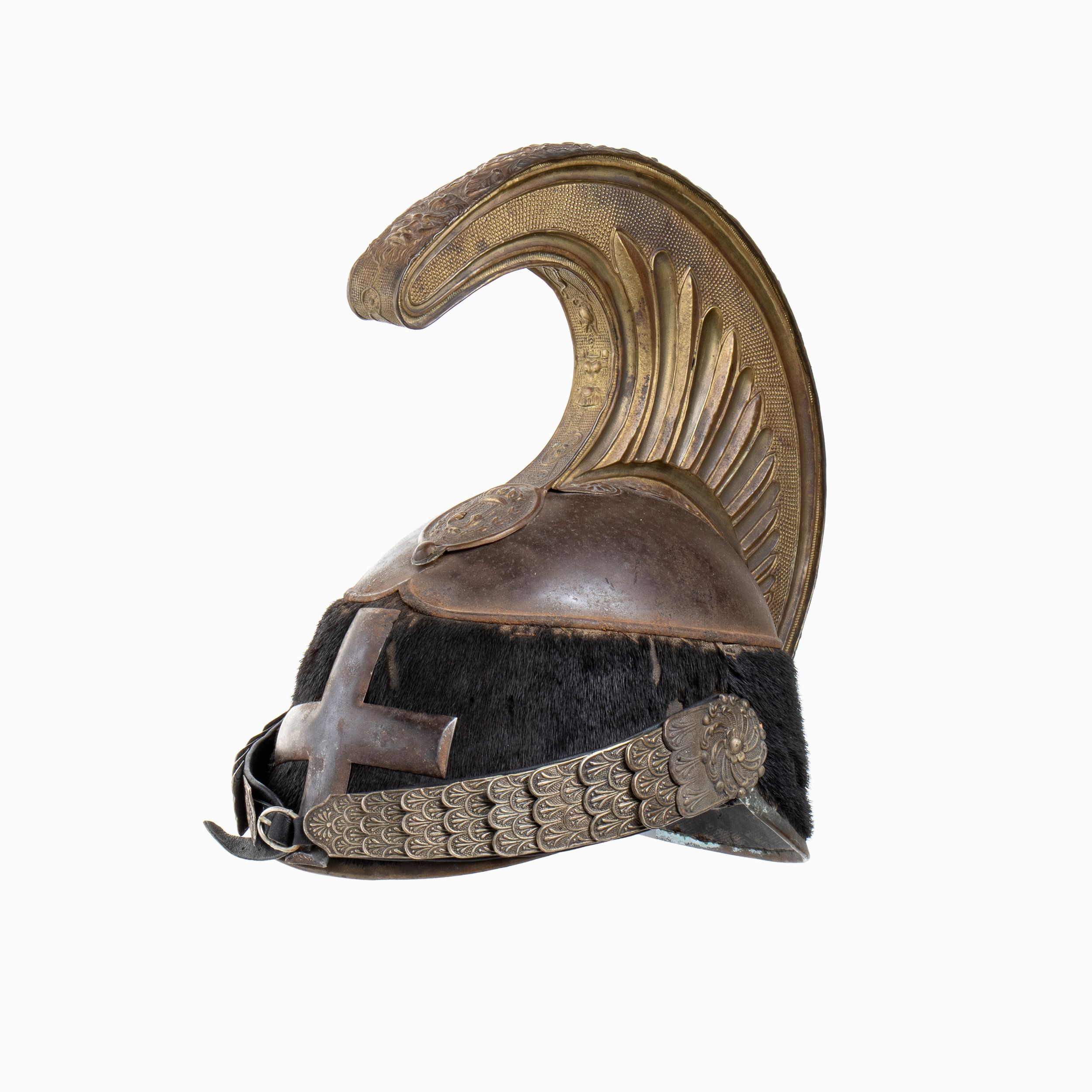 fine XIX sec. elmo da dragone con coppo e croce bombata in ferro, cimiero con olivetta riportante le cifre reali e soggolo di ottone, corpo ricoperto di pelo di foca, interno a dente di lupo, , in buono stato, eccetto alcune mancanze al pelo, in patina, la croce bombata lo identifica come elmo da sottufficiale anziano o da campagna da ufficiale
