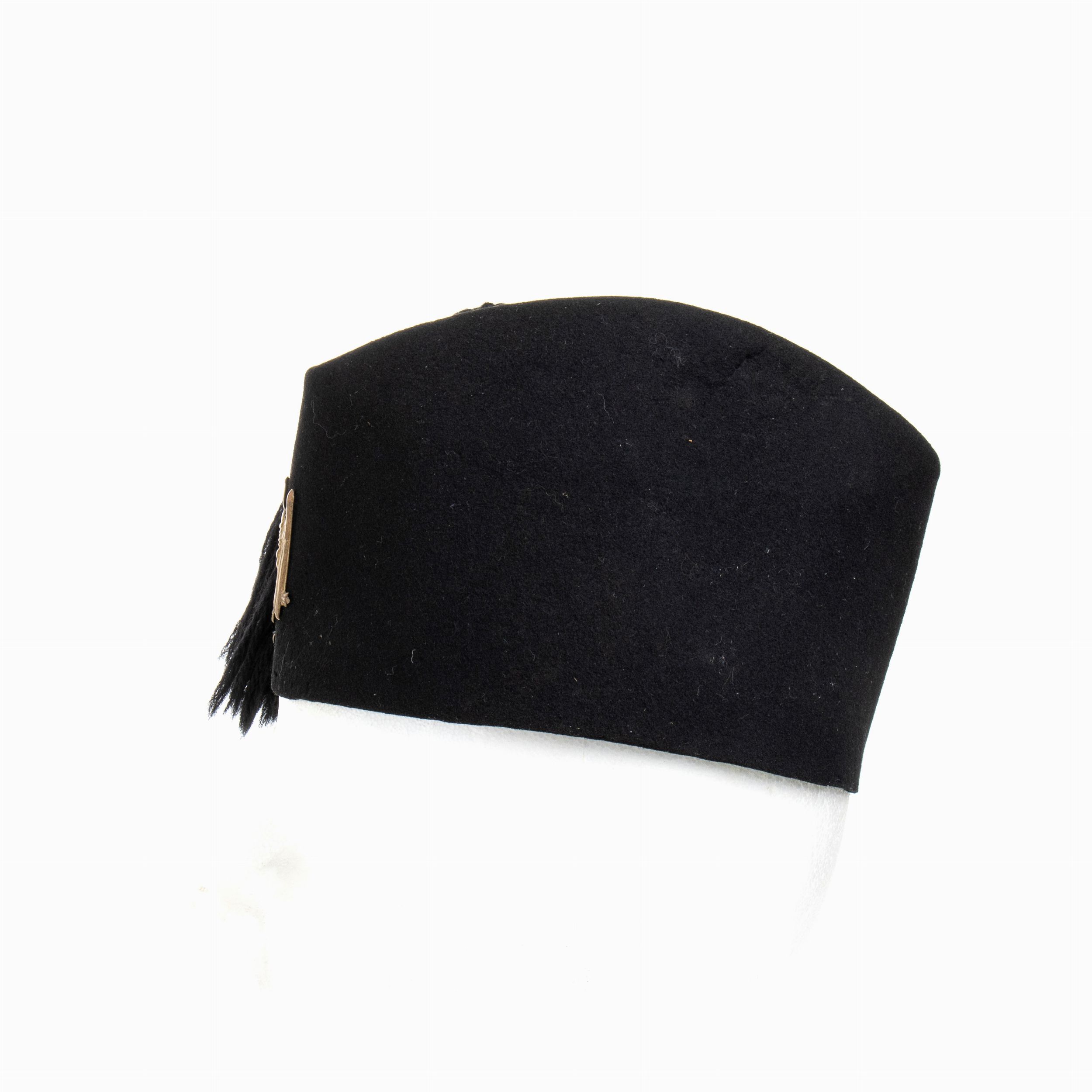 prima metà XX sec. corpo di feltro nero con fiocco di lana. fregio di ottone dorato, in ottimo stato