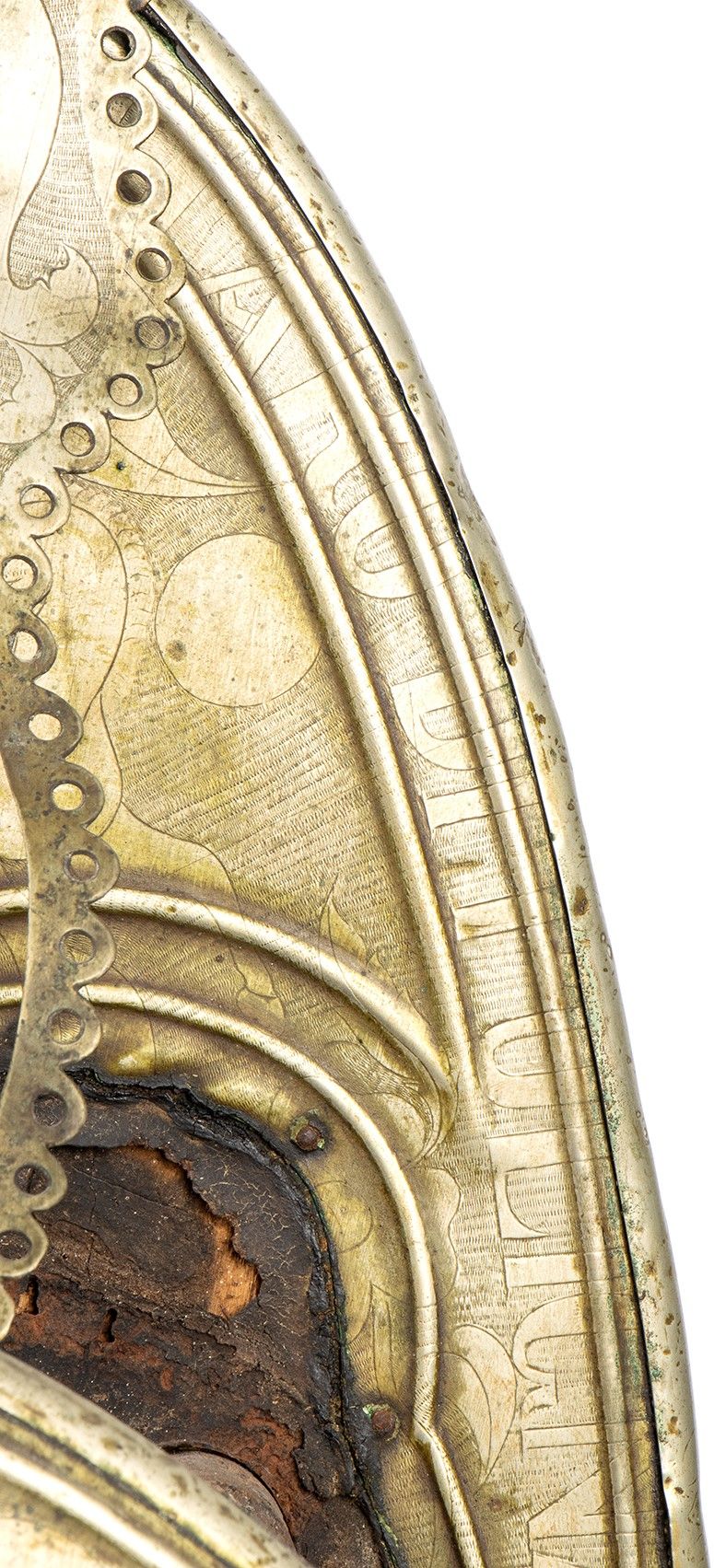Frontale di antico basto da mulo con decorazione incisa raffigurante S. Giorgio