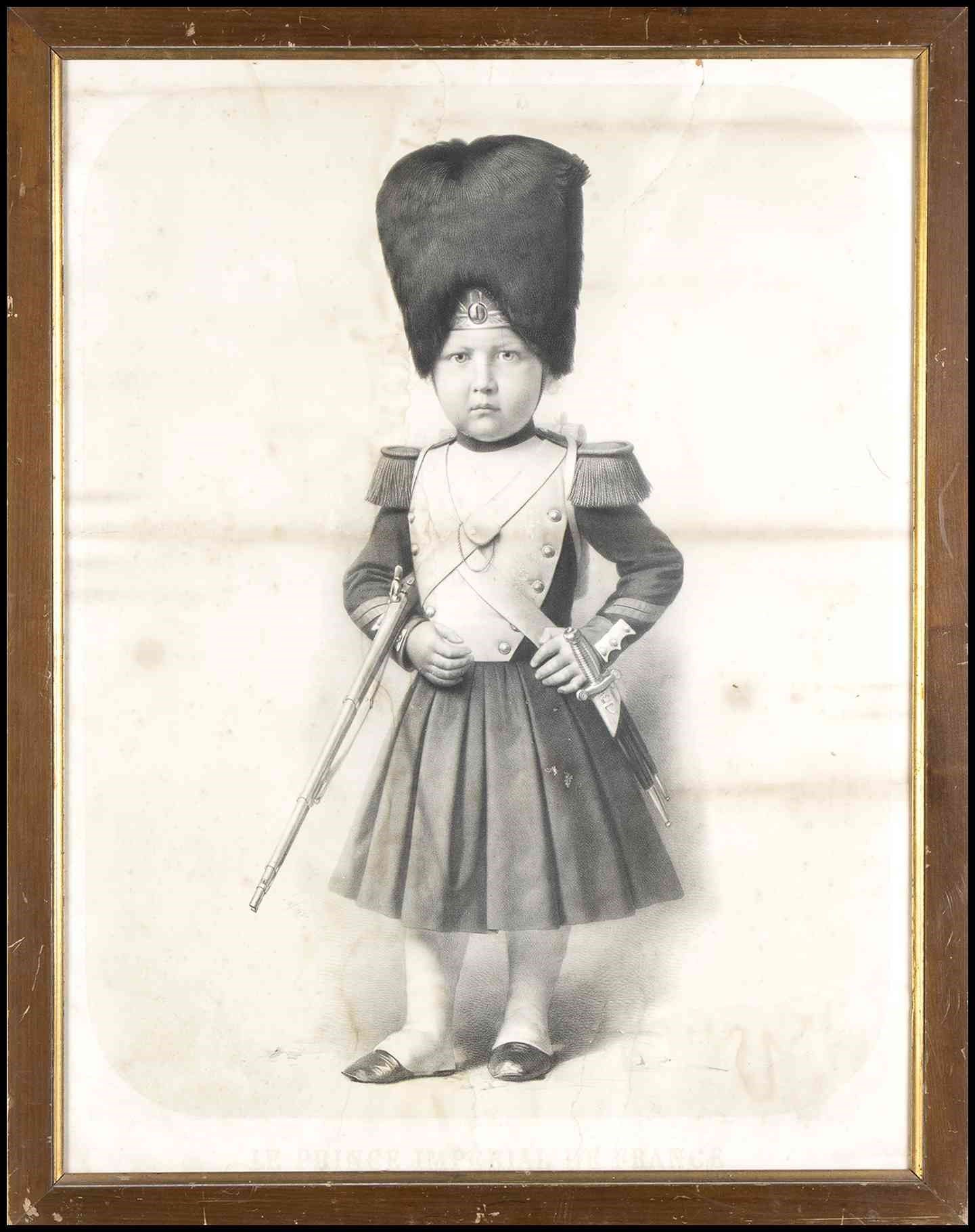 Casa Savoia e corti europee... litografia, 77 x 59 cm, con cornice, discreto stato di conservazione: macchie sparse, strappi