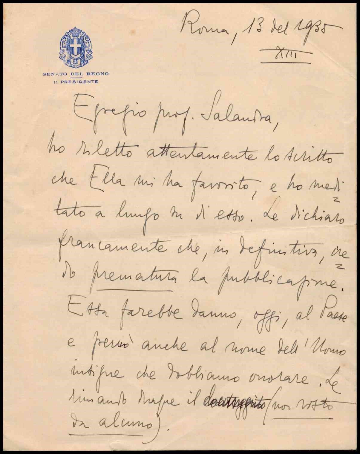 Lettera autografa di Luigi Federzoni, presidente del Senato del Regno e Ministr