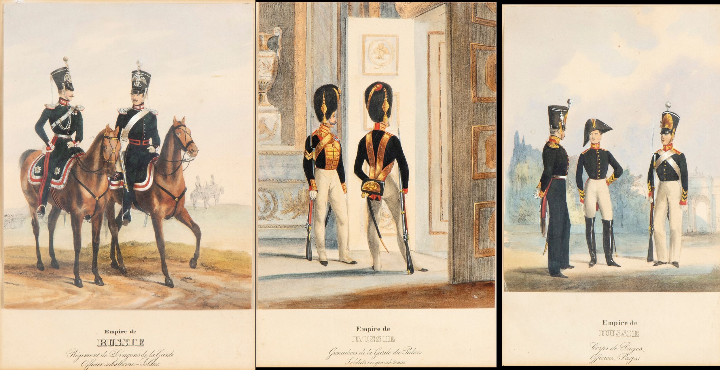 La prima stampa raffigura un soldato ed un ufficiale dei dragoni della guardia. La seconda raffigura due granatieri della guardia palatina in alta uniforme. La terza stampa raffigura due ufficiali ed un paggio del Corpo Dei Paggi Le dimensioni comprendono la cornice.