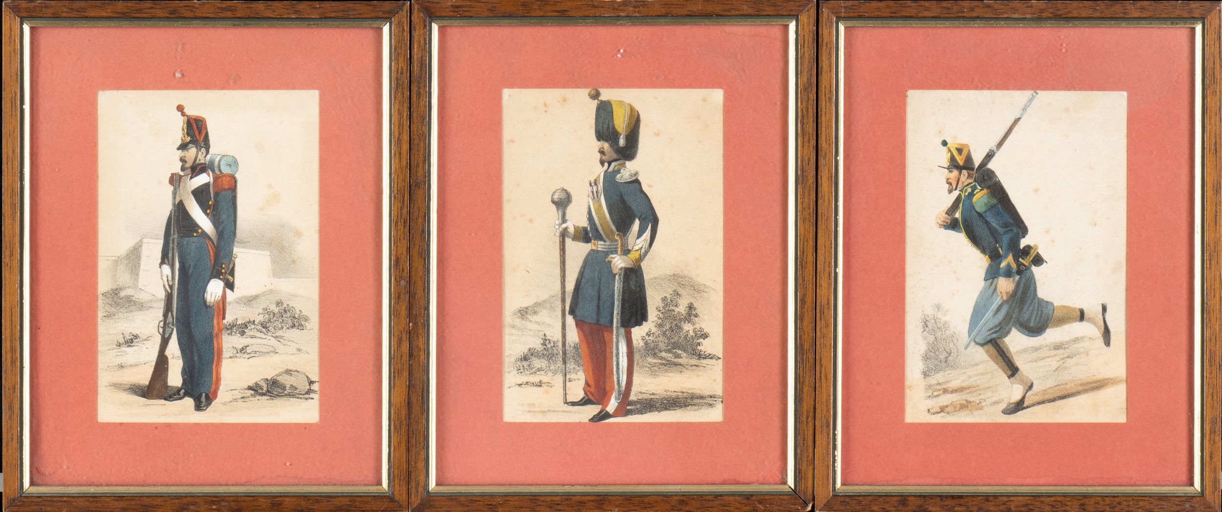 Lotto di tre stampe raffiguranti uniformi del secondo Impero francese, epoca Napoleone III