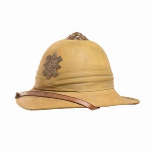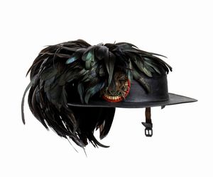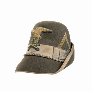 prima metà XX sec. feltro foderato alla falda di tela cerata, fregio di metallo dorato su coccarda di seta, interno [..]