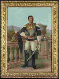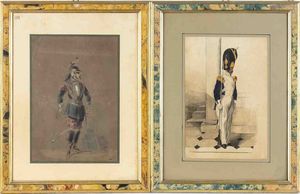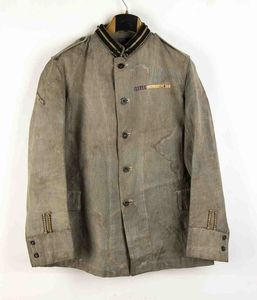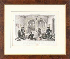 prima metà XX sec. in panno turchino filettato rosso, fregio in cotone bianco, soggolo, interno in tela di cotone, [..]